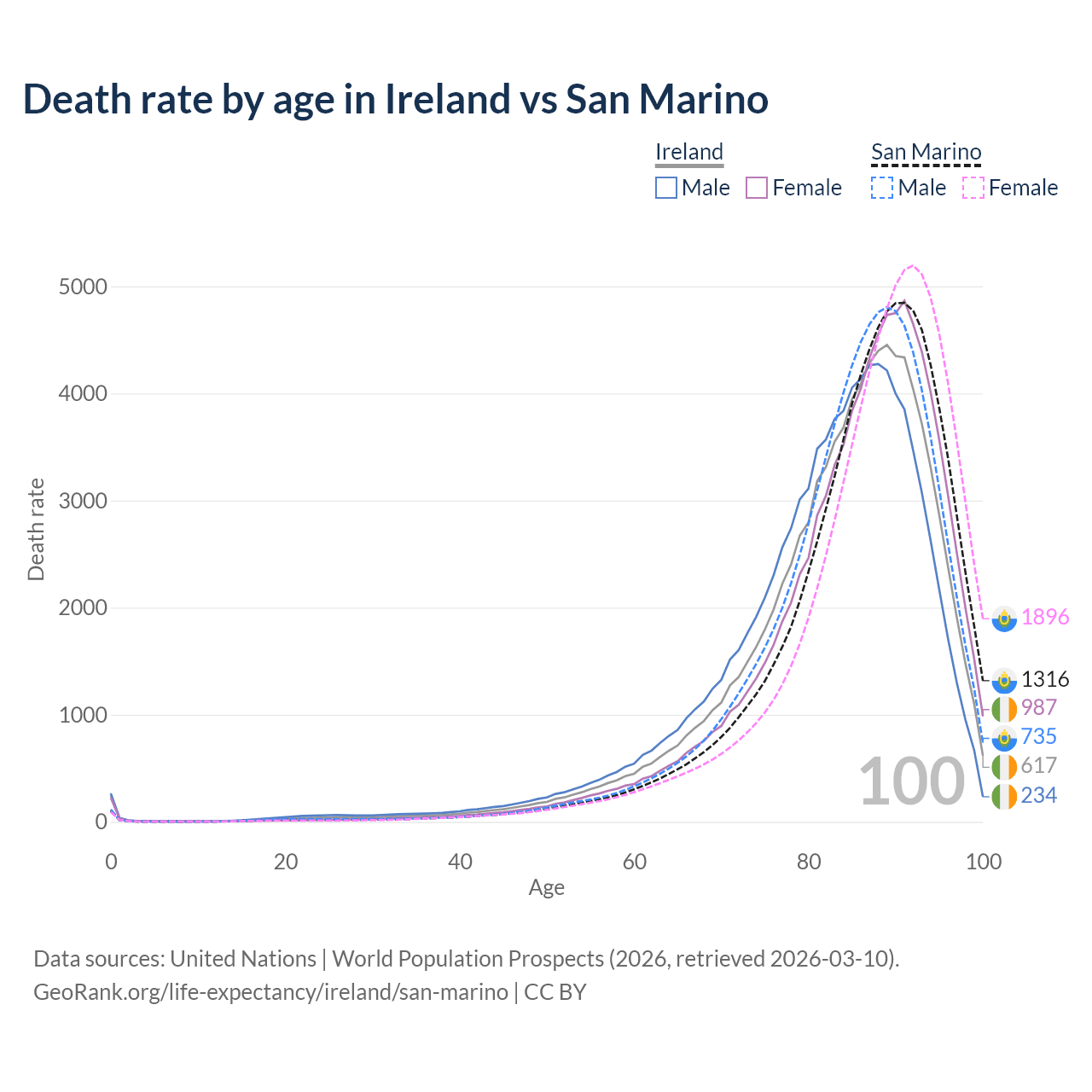 In Ireland, the most common age of death is 89, compared to 91 in San Marino. The median age of death is 85.7 in Ireland and 88.3 in San Marino, meaning only half of each cohort is expected to live past that age.