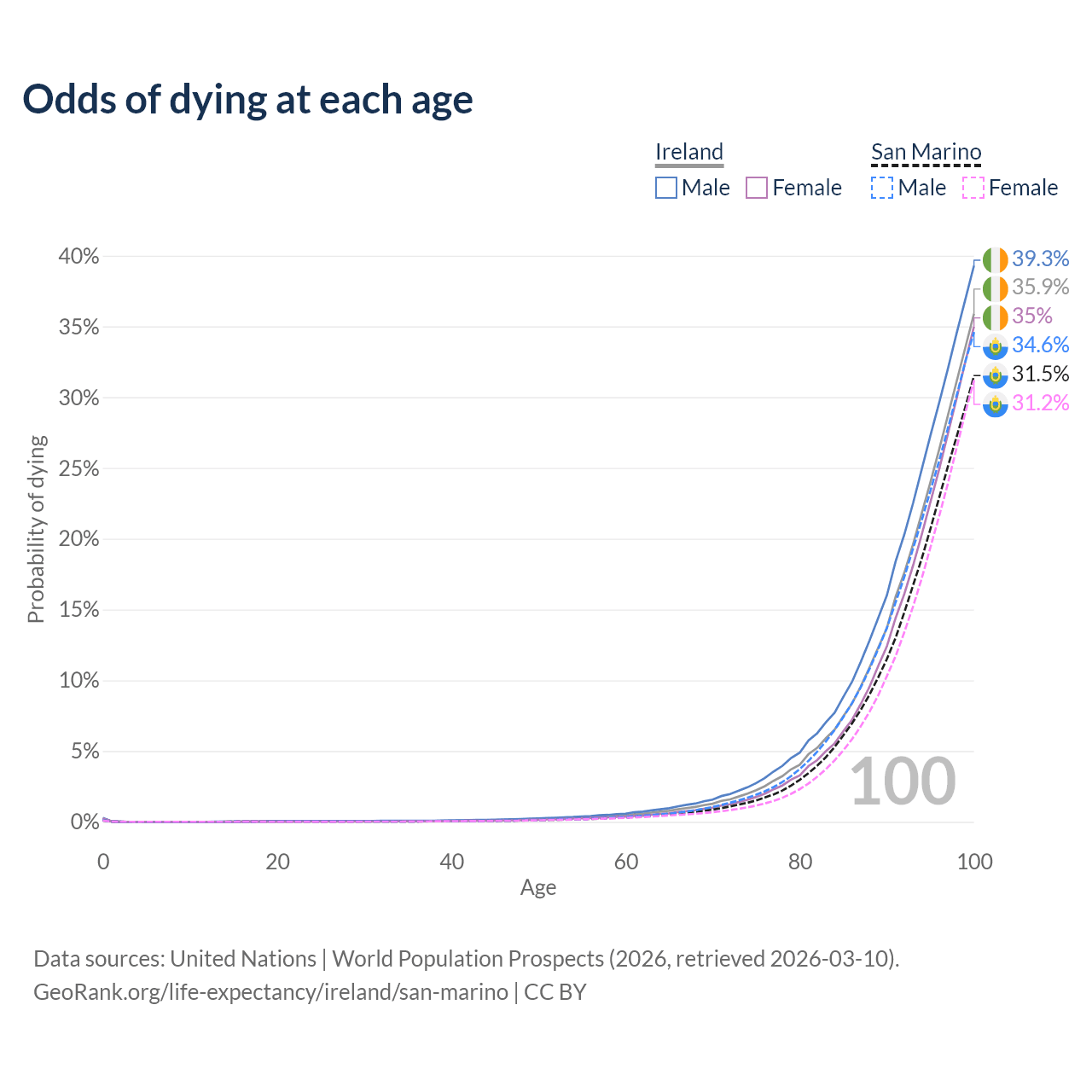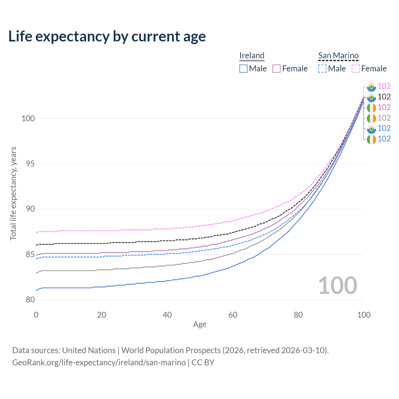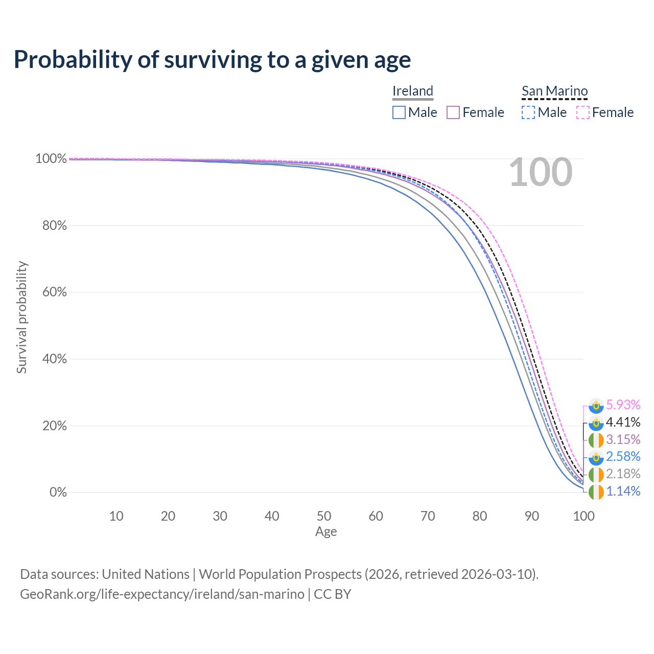 This life expectancy calculator shows the odds of living to 100, 95, 90, and below based on current age for both males and females in Ireland and San Marino, along with mean and median age of death. The calculations are based on the 2026 life tables (actuarial tables) from the UN World Population Prospects.