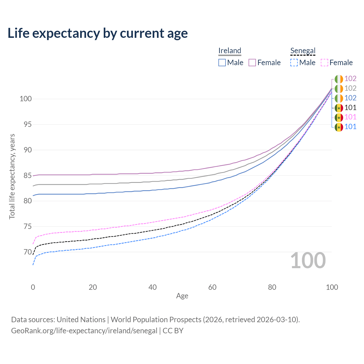 This life expectancy calculator shows the odds of living to 100, 95, 90, and below based on current age for both males and females in Ireland and Senegal, along with mean and median age of death. The calculations are based on the 2026 life tables (actuarial tables) from the UN World Population Prospects.