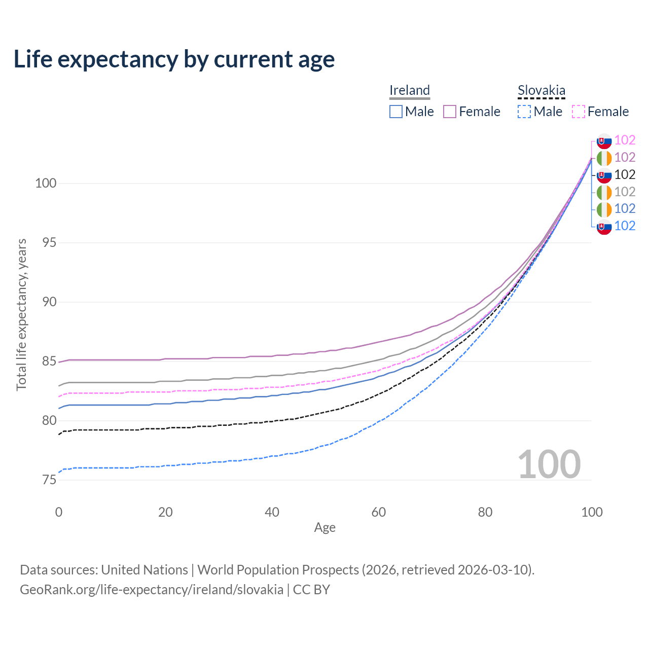 This life expectancy calculator shows the odds of living to 100, 95, 90, and below based on current age for both males and females in Ireland and Slovakia, along with mean and median age of death. The calculations are based on the 2026 life tables (actuarial tables) from the UN World Population Prospects.
