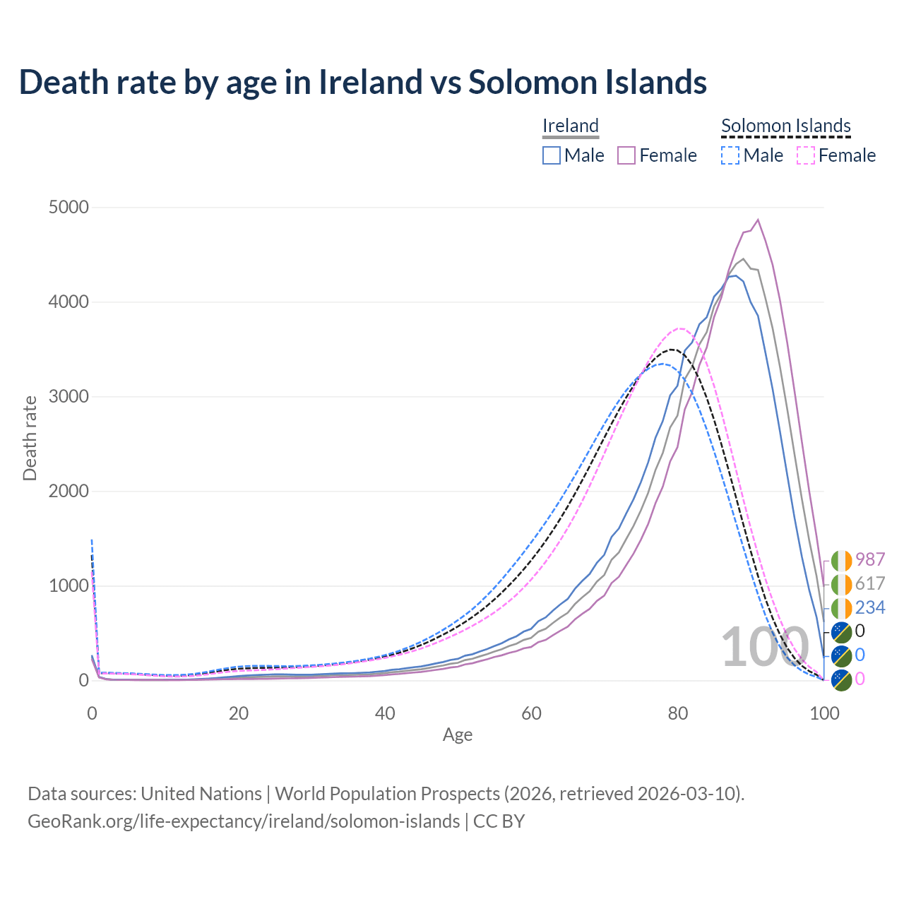 In Ireland, the most common age of death is 89, compared to 79 in the Solomon Islands. The median age of death is 85.7 in Ireland and 74.9 in the Solomon Islands, meaning only half of each cohort is expected to live past that age.