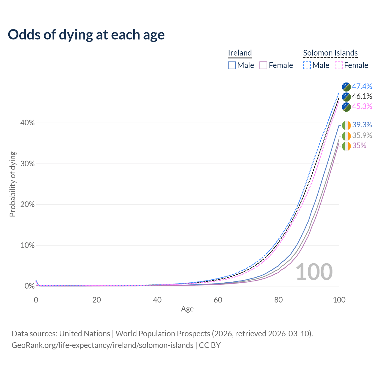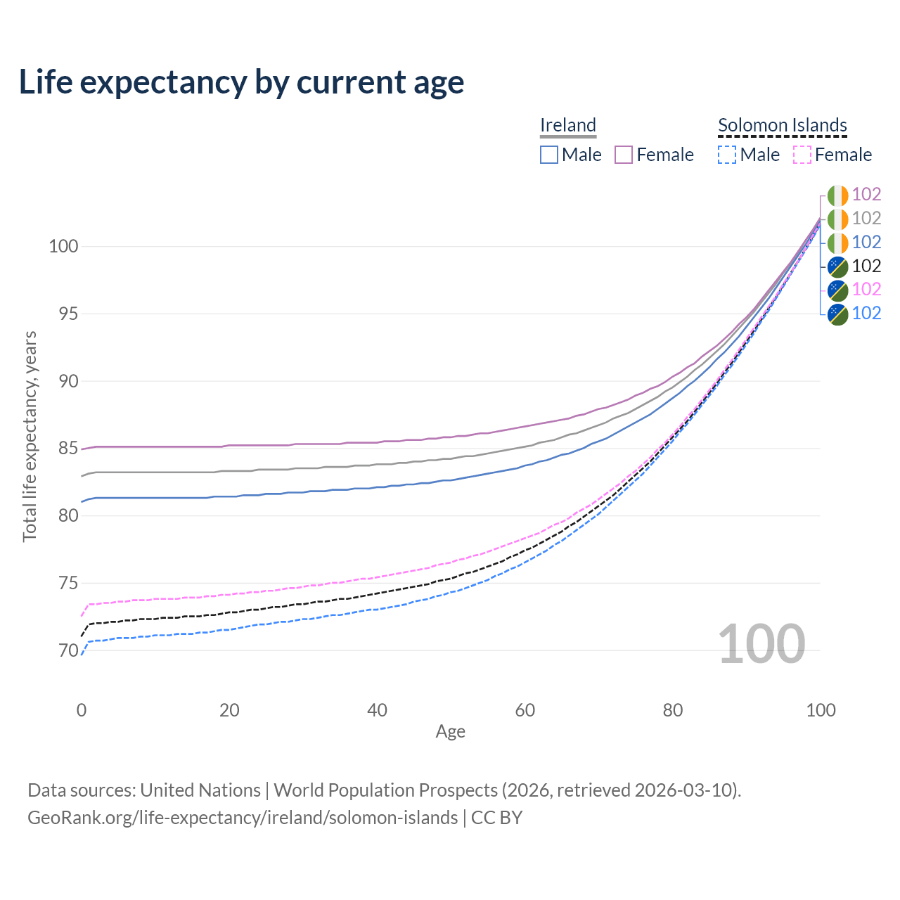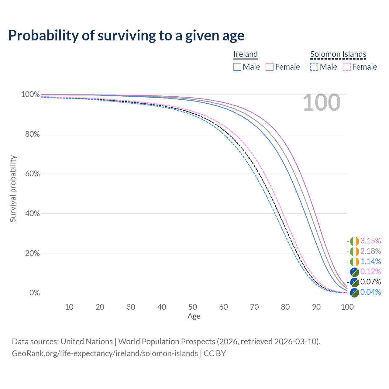 This life expectancy calculator shows the odds of living to 100, 95, 90, and below based on current age for both males and females in Ireland and the Solomon Islands, along with mean and median age of death. The calculations are based on the 2026 life tables (actuarial tables) from the UN World Population Prospects.