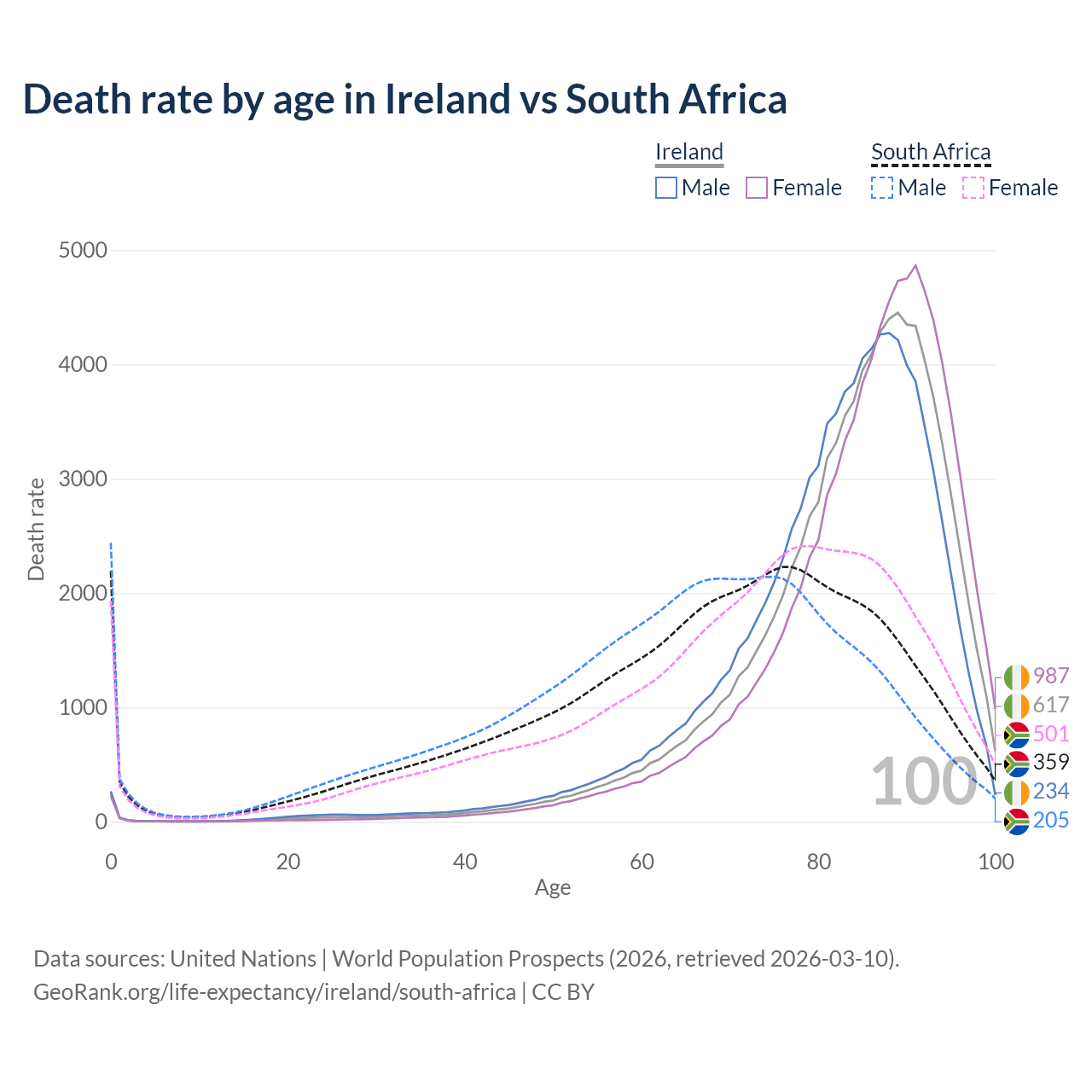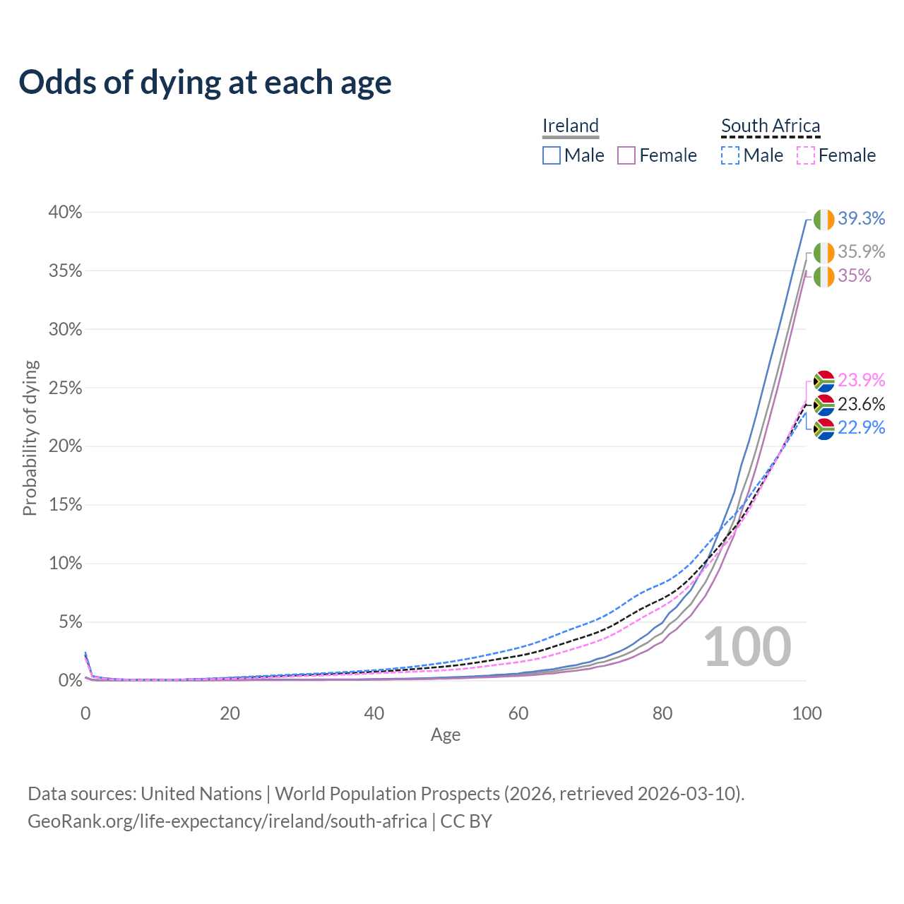 This life expectancy calculator shows the odds of living to 100, 95, 90, and below based on current age for both males and females in Ireland and South Africa, along with mean and median age of death. The calculations are based on the 2026 life tables (actuarial tables) from the UN World Population Prospects.
