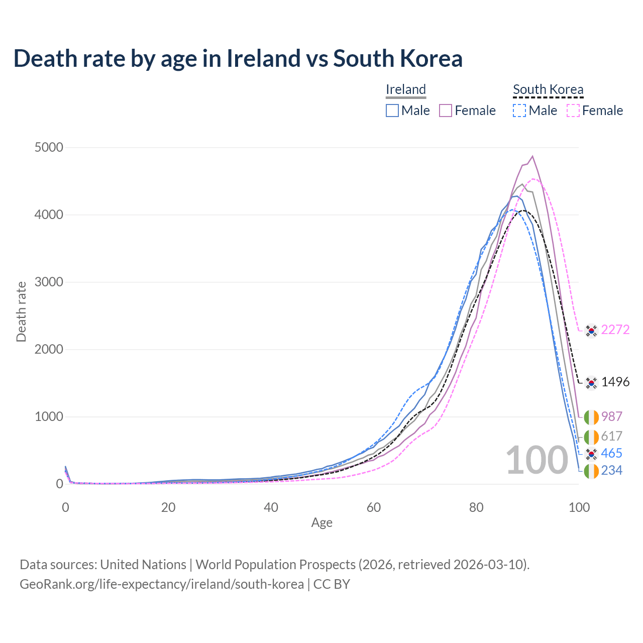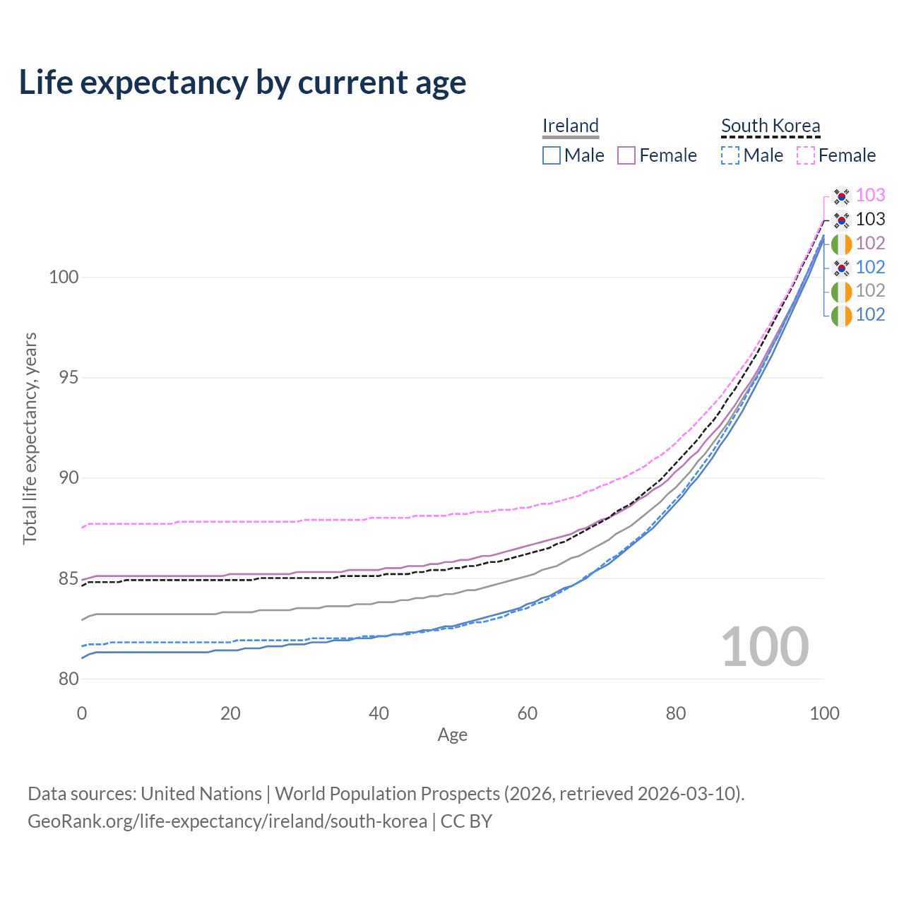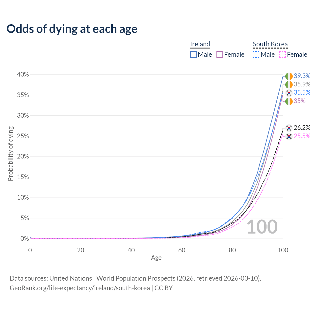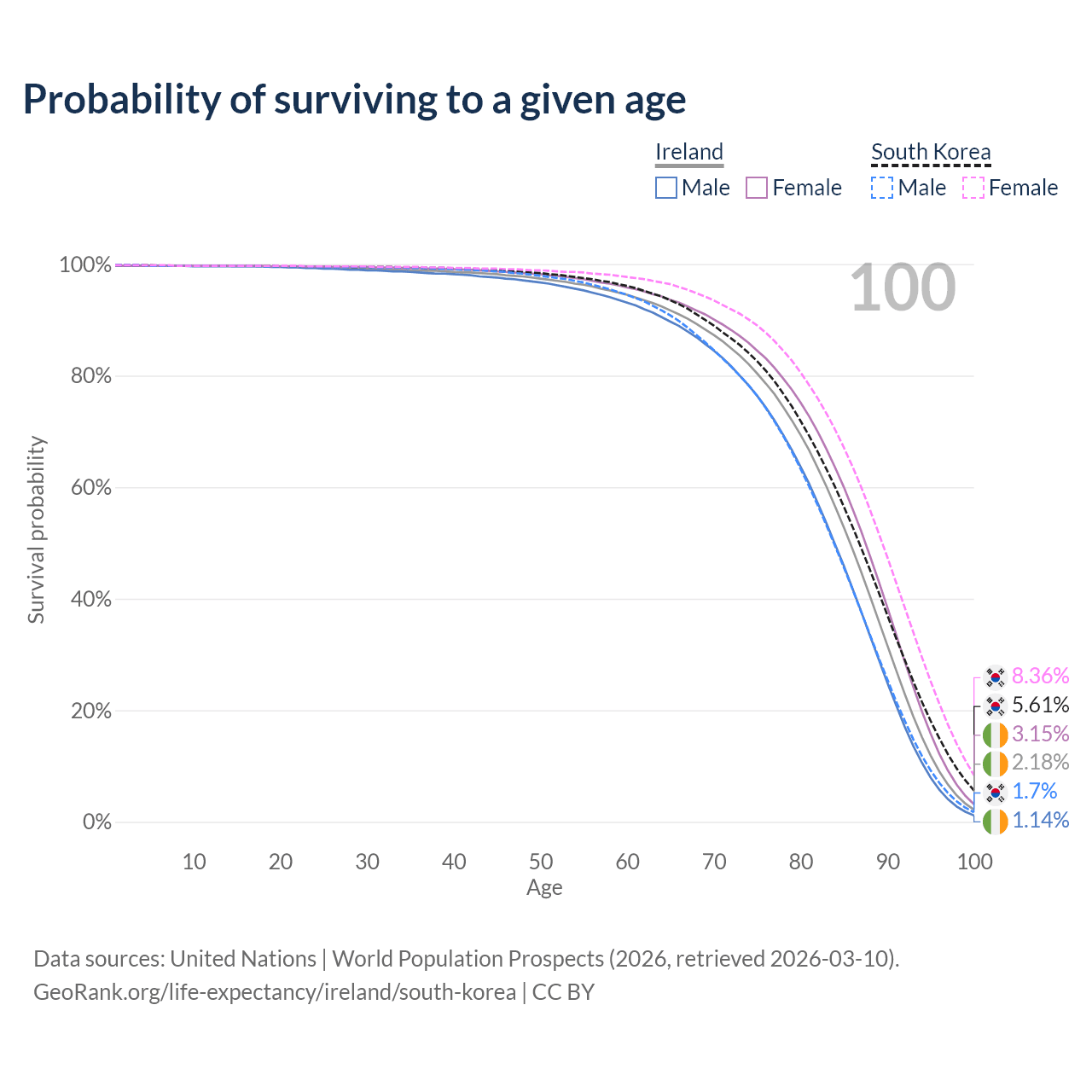 This life expectancy calculator shows the odds of living to 100, 95, 90, and below based on current age for both males and females in Ireland and South Korea, along with mean and median age of death. The calculations are based on the 2026 life tables (actuarial tables) from the UN World Population Prospects.