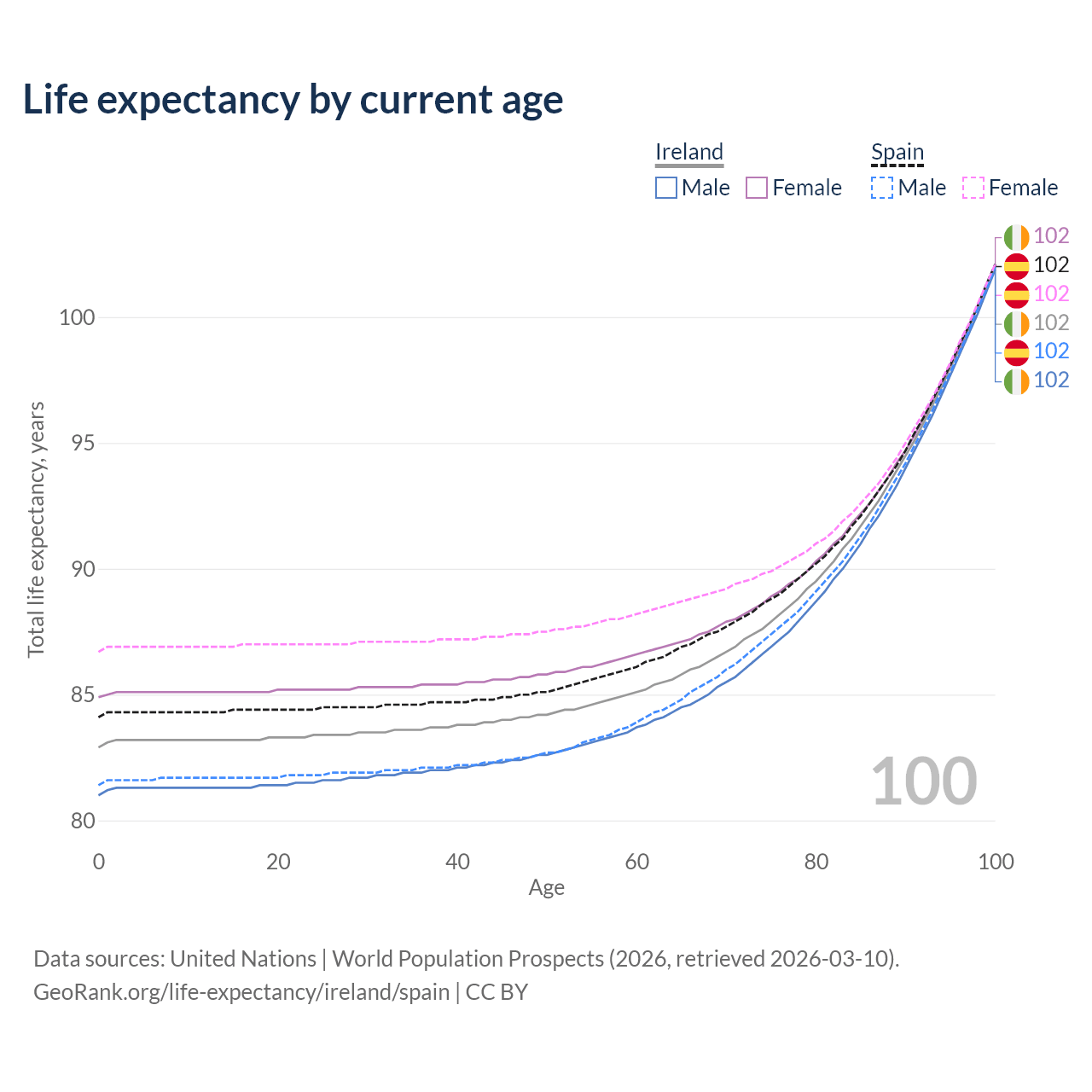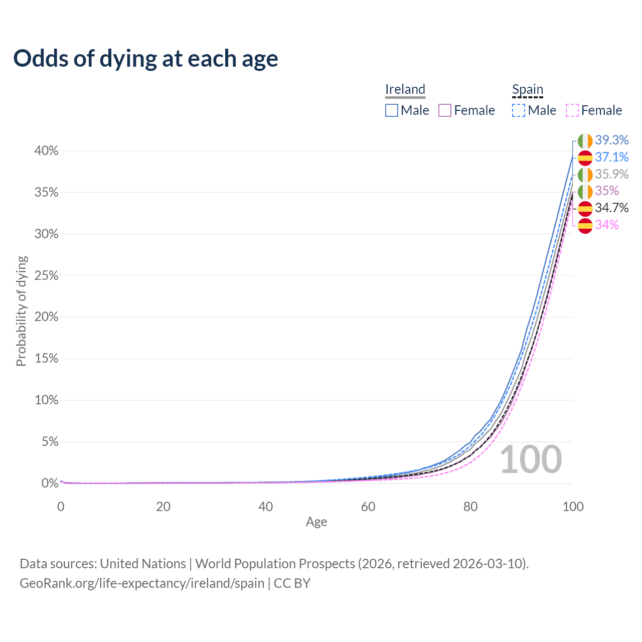 This life expectancy calculator shows the odds of living to 100, 95, 90, and below based on current age for both males and females in Ireland and Spain, along with mean and median age of death. The calculations are based on the 2026 life tables (actuarial tables) from the UN World Population Prospects.