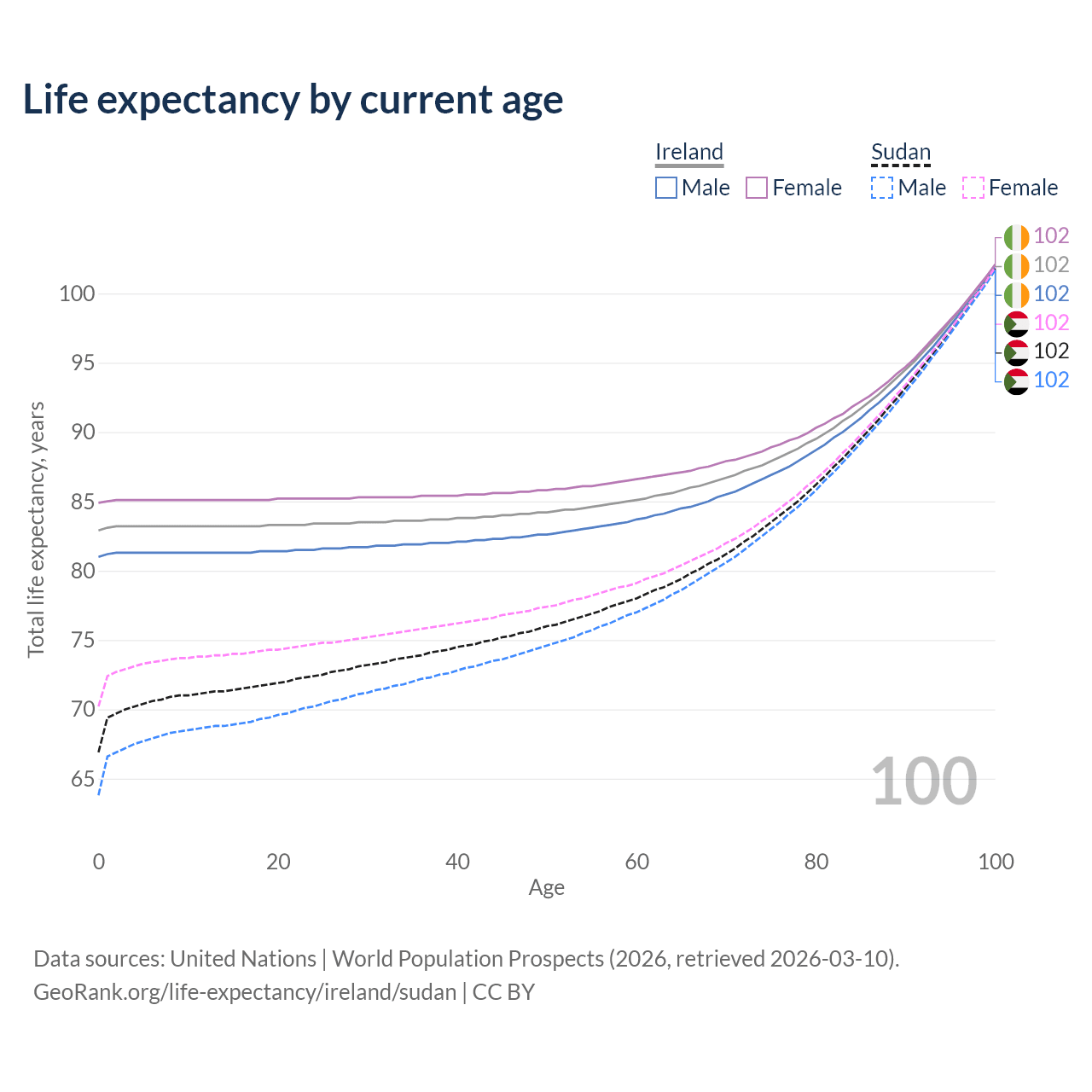 This life expectancy calculator shows the odds of living to 100, 95, 90, and below based on current age for both males and females in Ireland and Sudan, along with mean and median age of death. The calculations are based on the 2026 life tables (actuarial tables) from the UN World Population Prospects.