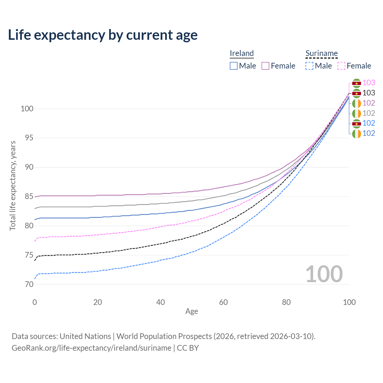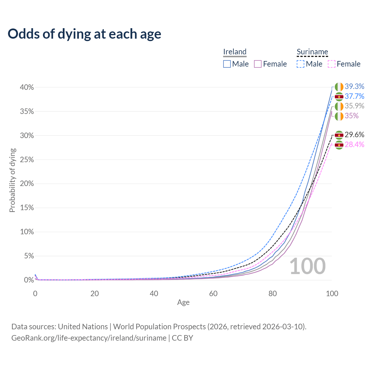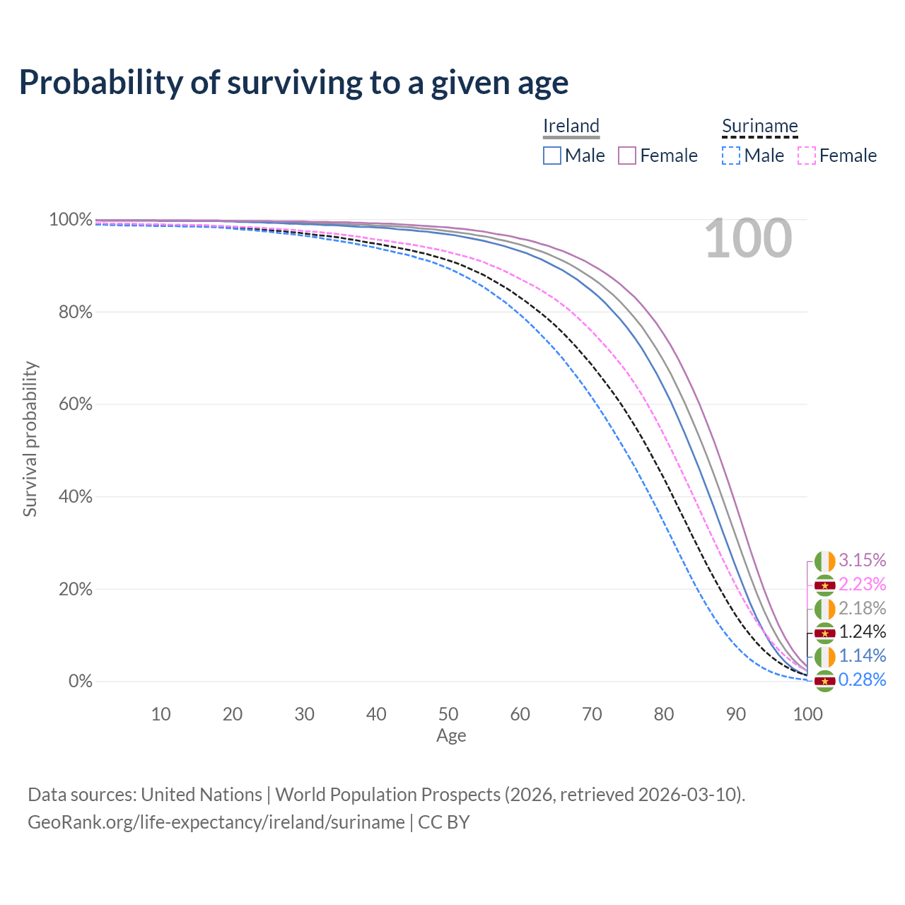 This life expectancy calculator shows the odds of living to 100, 95, 90, and below based on current age for both males and females in Ireland and Suriname, along with mean and median age of death. The calculations are based on the 2026 life tables (actuarial tables) from the UN World Population Prospects.