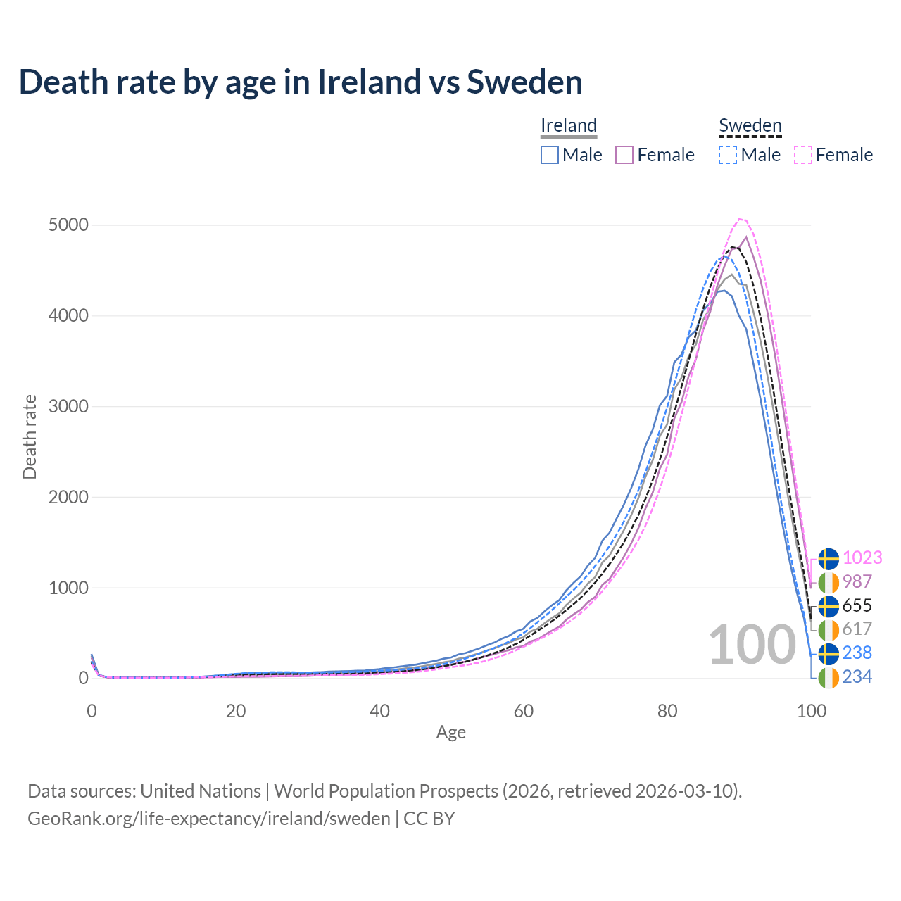 In Ireland, the most common age of death is 89, compared to 89 in Sweden. The median age of death is 85.7 in Ireland and 86.5 in Sweden, meaning only half of each cohort is expected to live past that age.
