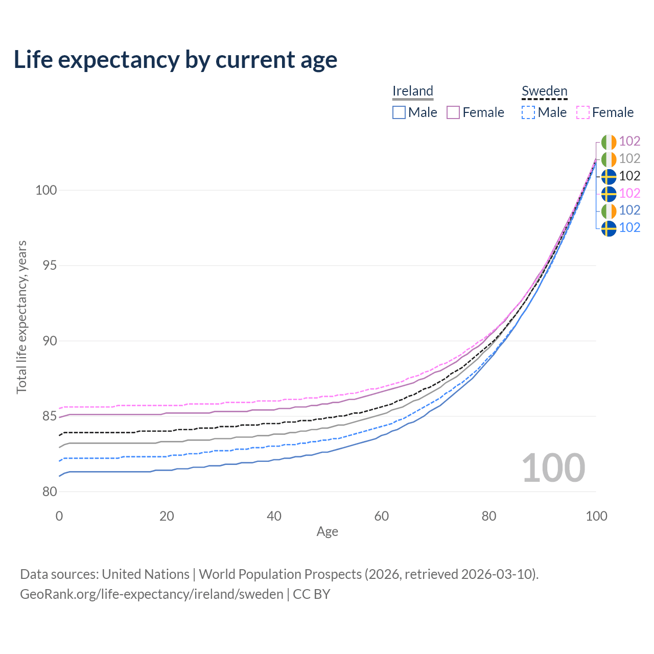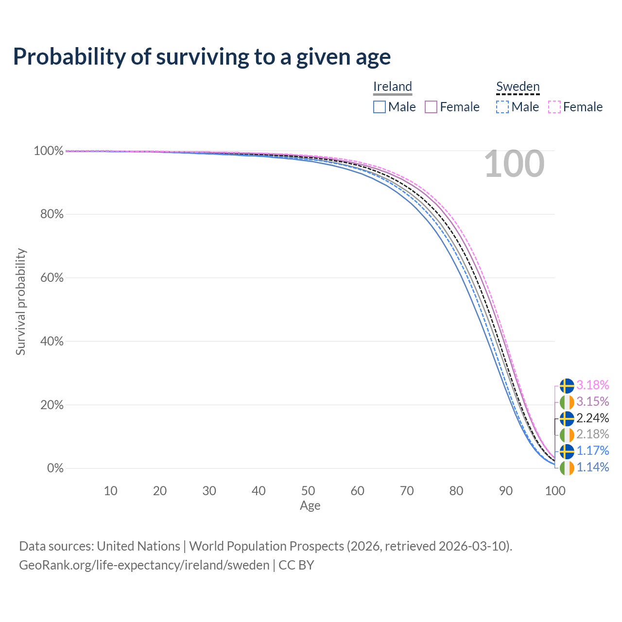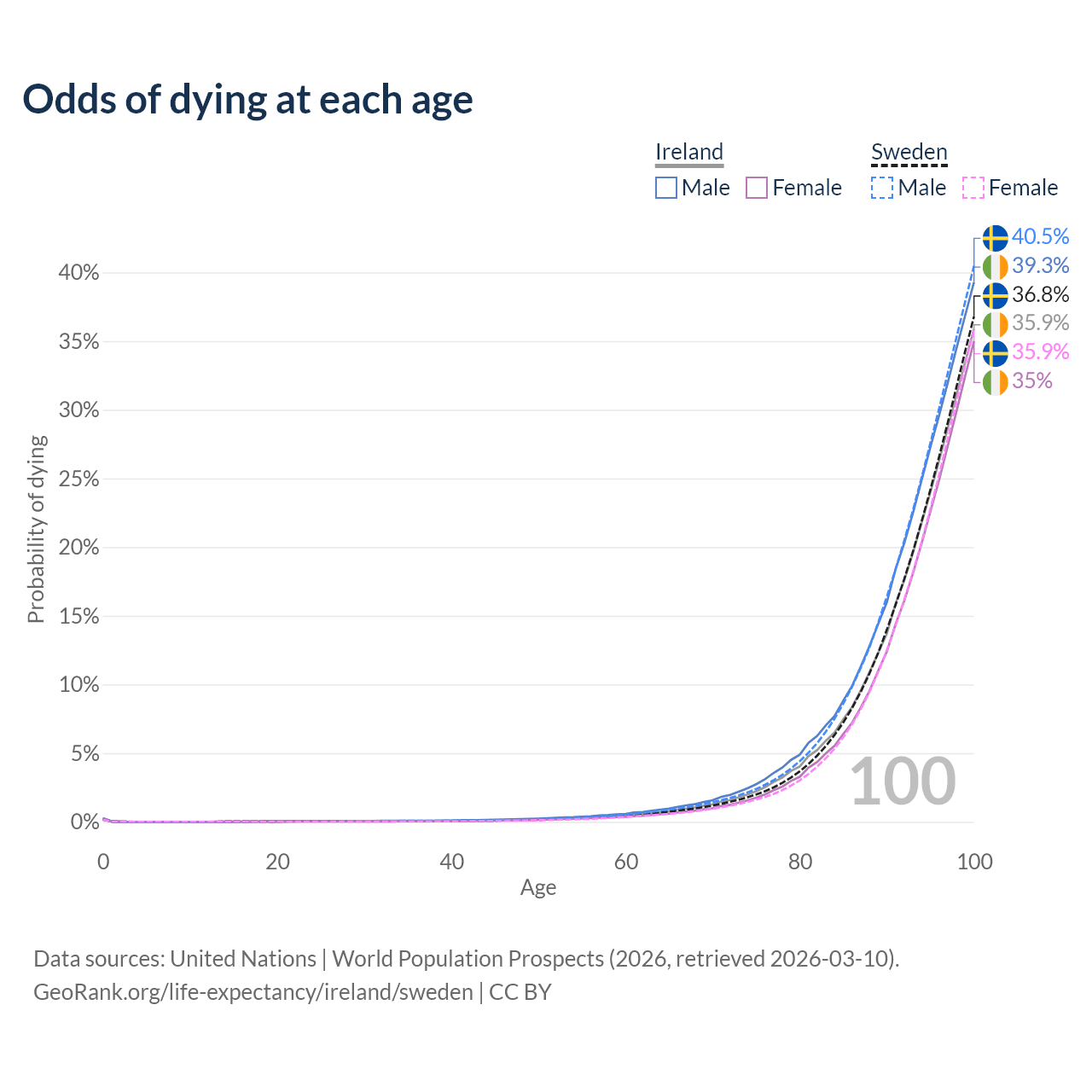 This life expectancy calculator shows the odds of living to 100, 95, 90, and below based on current age for both males and females in Ireland and Sweden, along with mean and median age of death. The calculations are based on the 2026 life tables (actuarial tables) from the UN World Population Prospects.