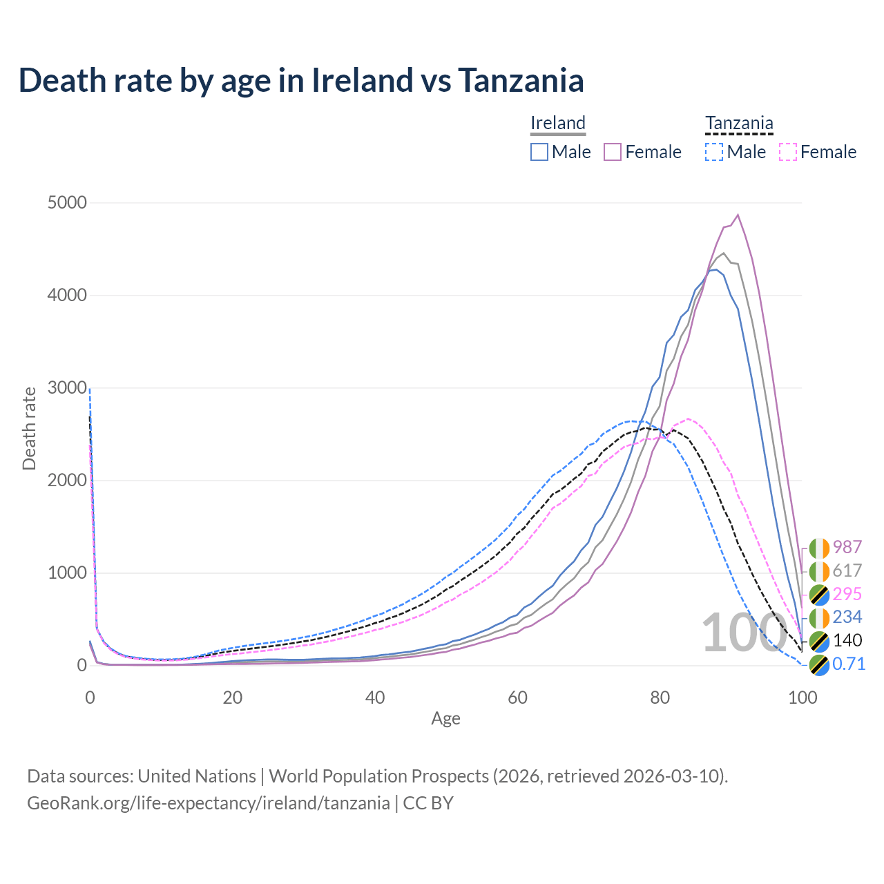 In Ireland, the most common age of death is 89, compared to 0 in Tanzania. The median age of death is 85.7 in Ireland and 72.6 in Tanzania, meaning only half of each cohort is expected to live past that age.
