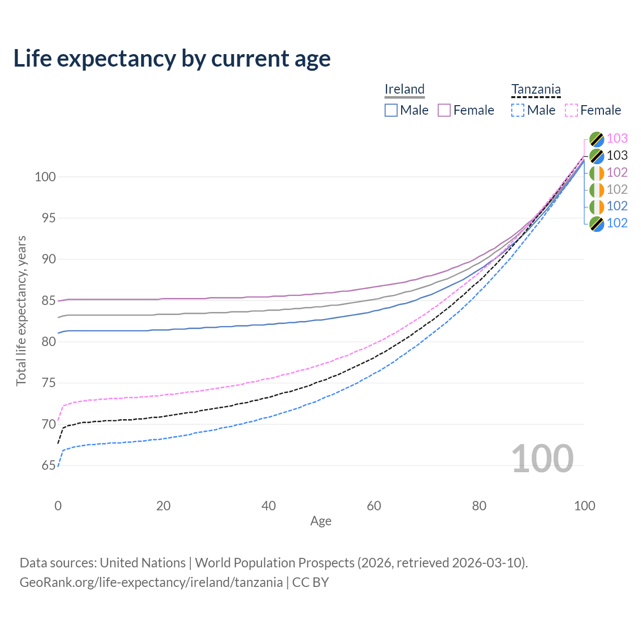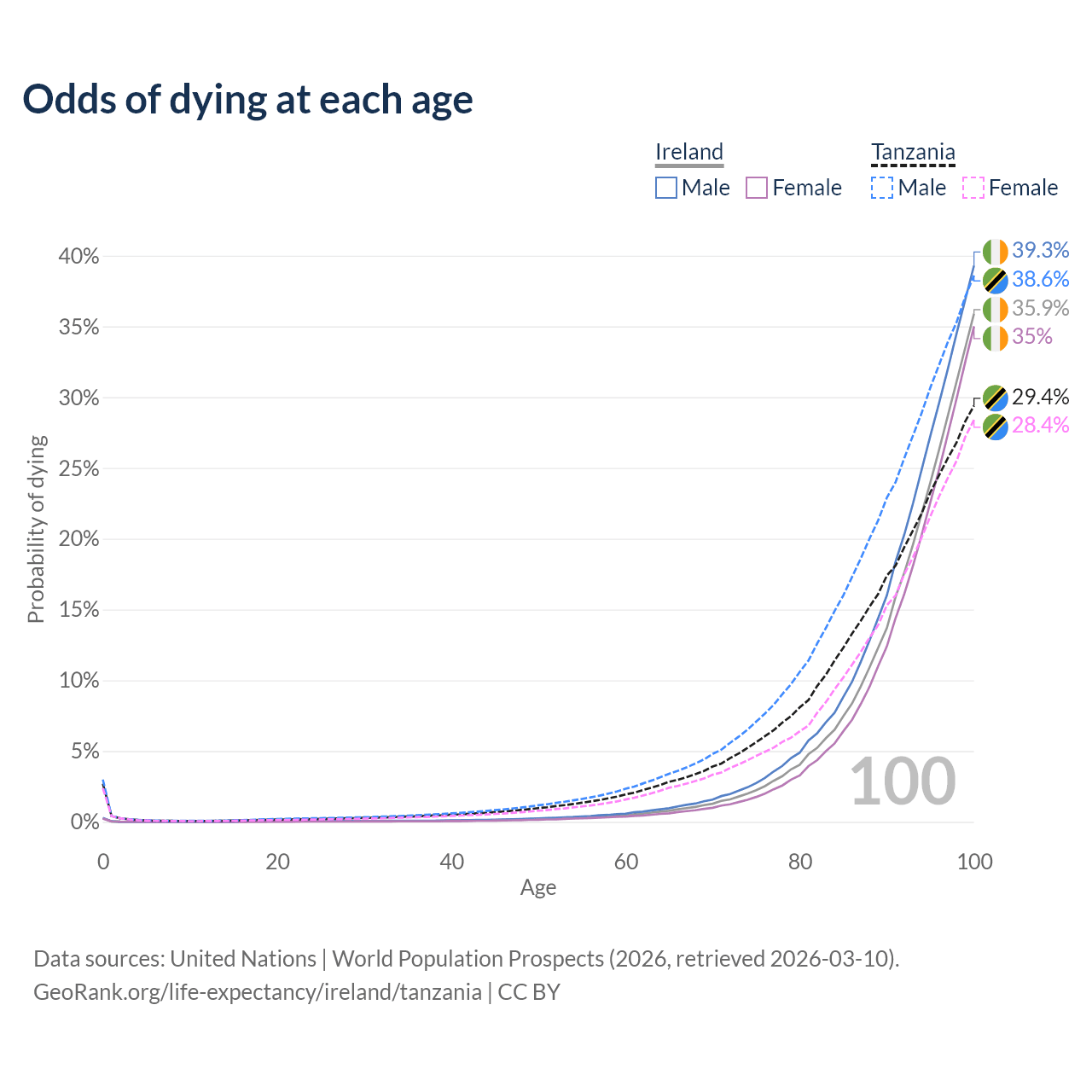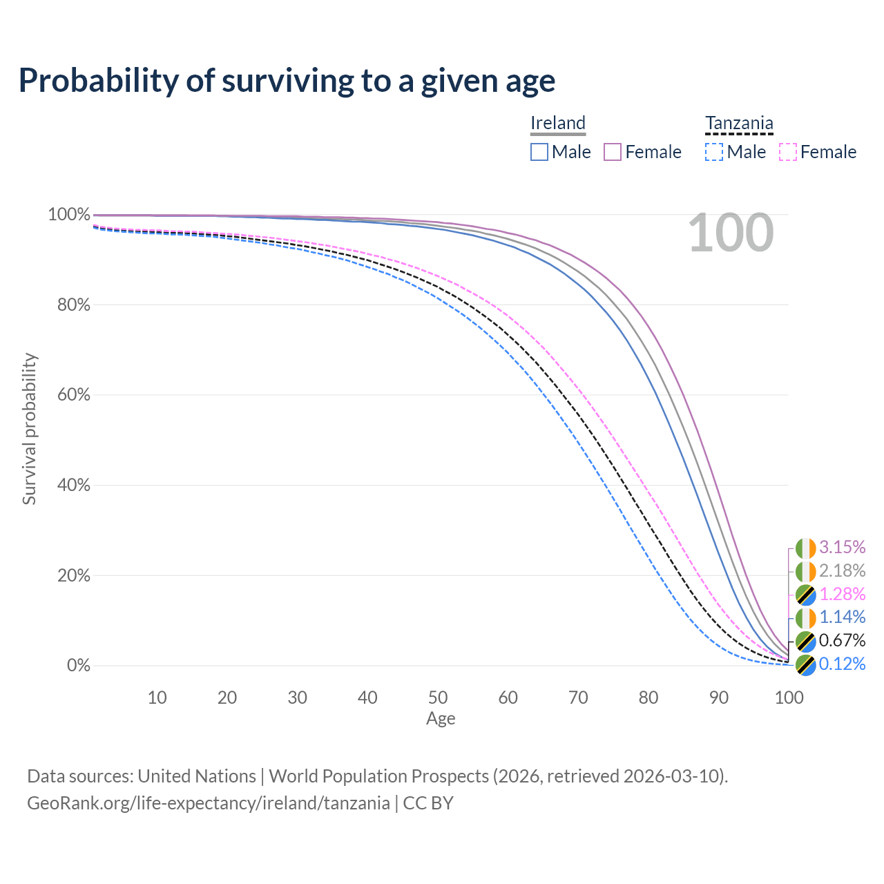 This life expectancy calculator shows the odds of living to 100, 95, 90, and below based on current age for both males and females in Ireland and Tanzania, along with mean and median age of death. The calculations are based on the 2026 life tables (actuarial tables) from the UN World Population Prospects.