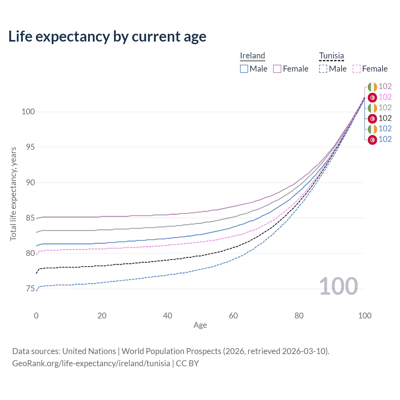 This life expectancy calculator shows the odds of living to 100, 95, 90, and below based on current age for both males and females in Ireland and Tunisia, along with mean and median age of death. The calculations are based on the 2026 life tables (actuarial tables) from the UN World Population Prospects.