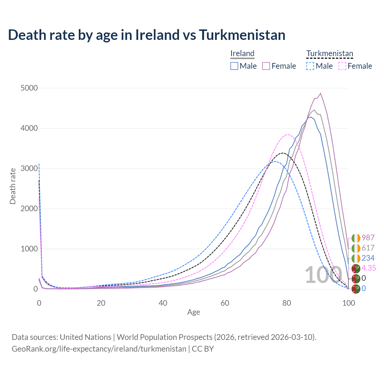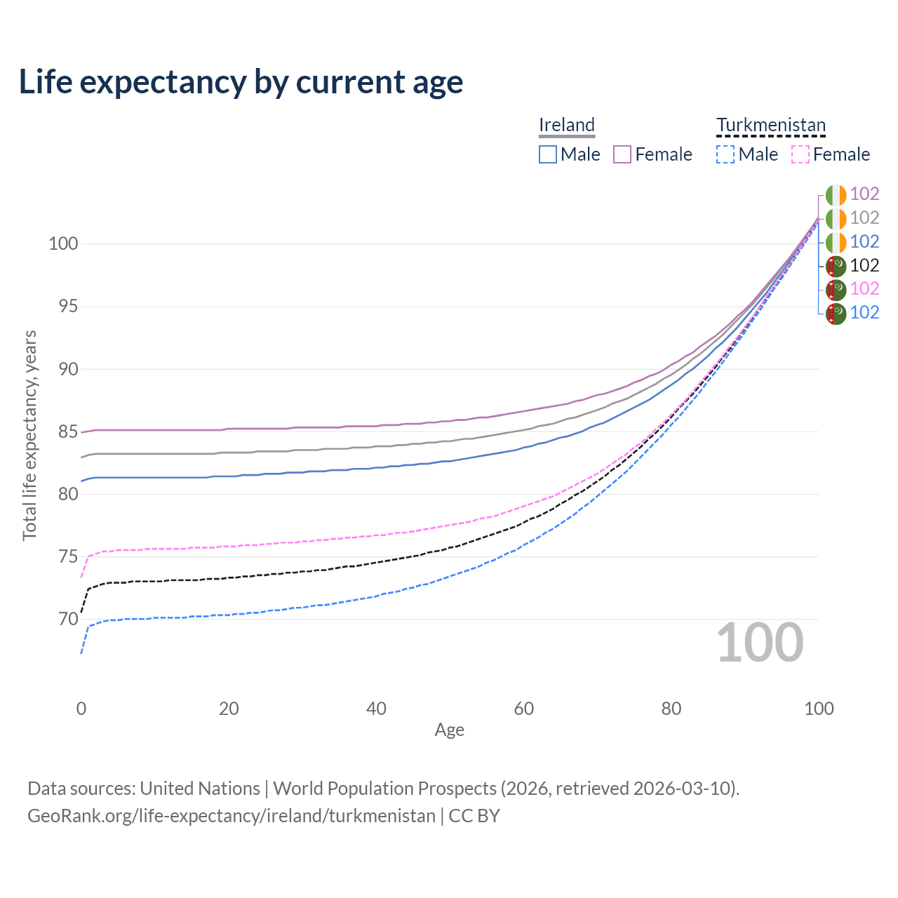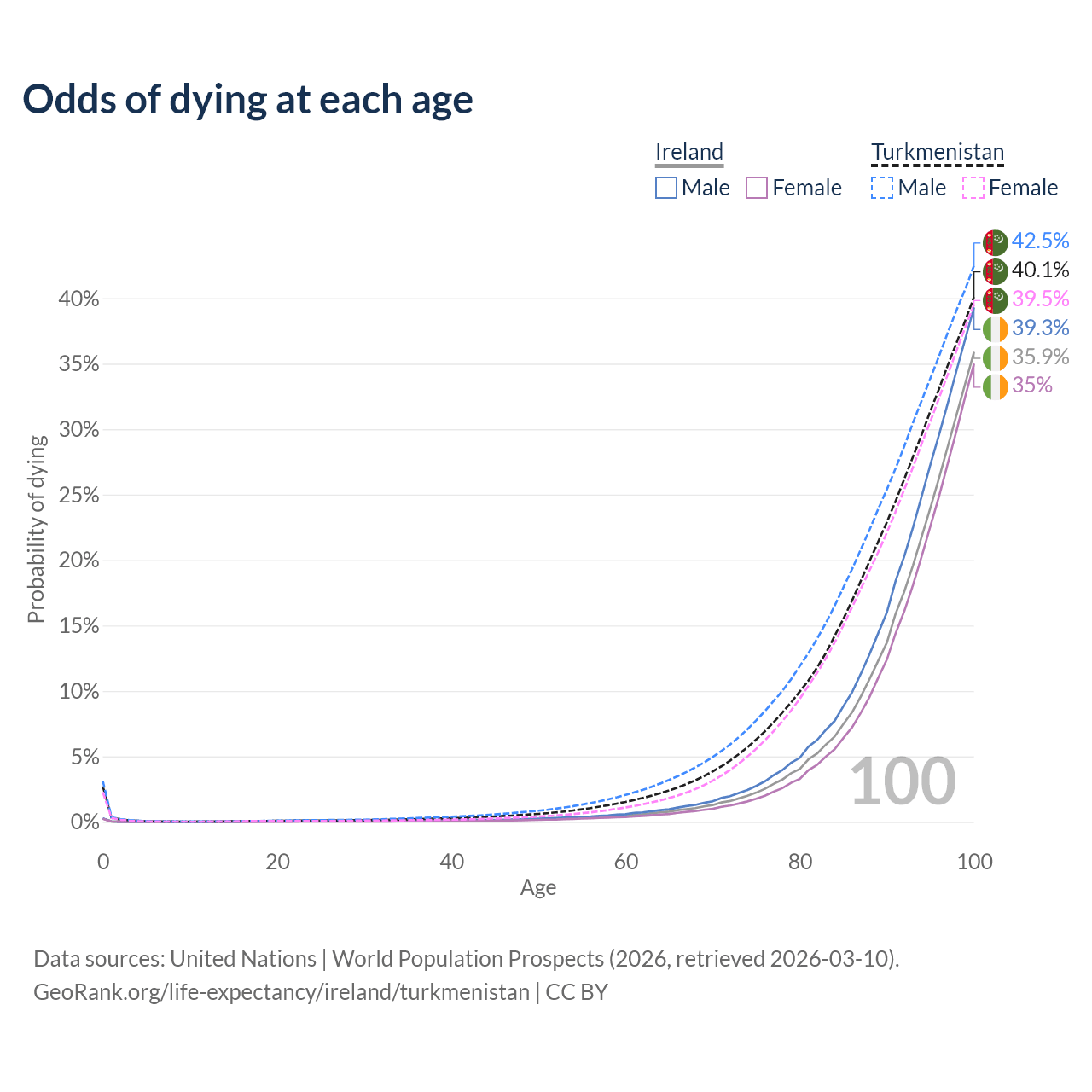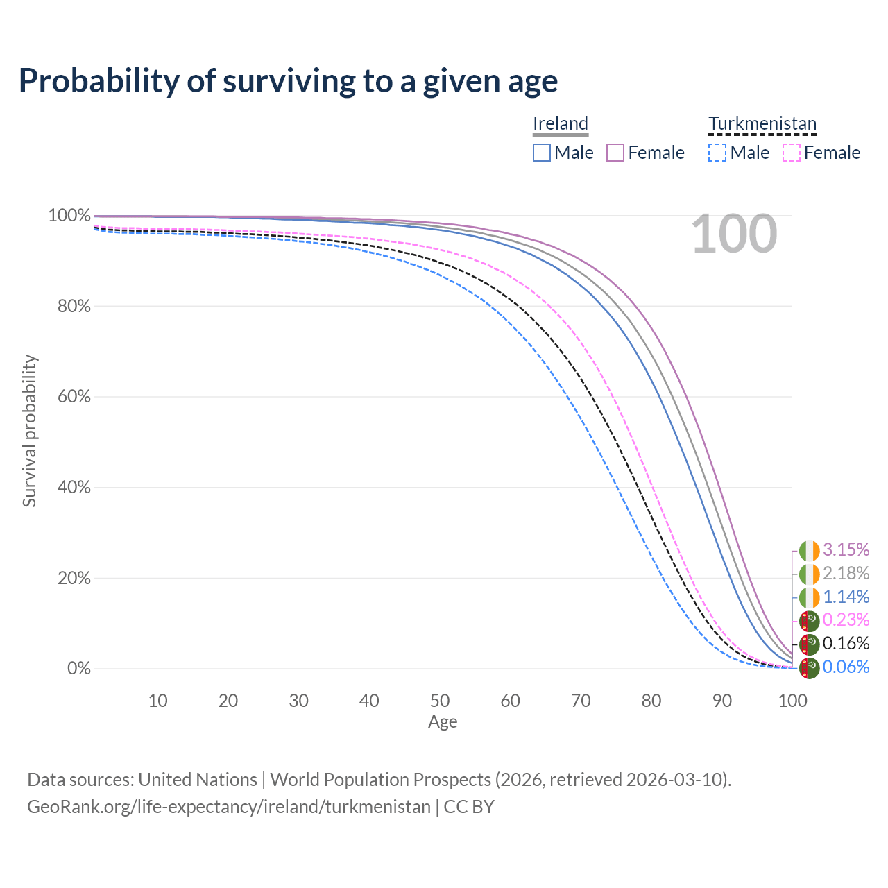 This life expectancy calculator shows the odds of living to 100, 95, 90, and below based on current age for both males and females in Ireland and Turkmenistan, along with mean and median age of death. The calculations are based on the 2026 life tables (actuarial tables) from the UN World Population Prospects.