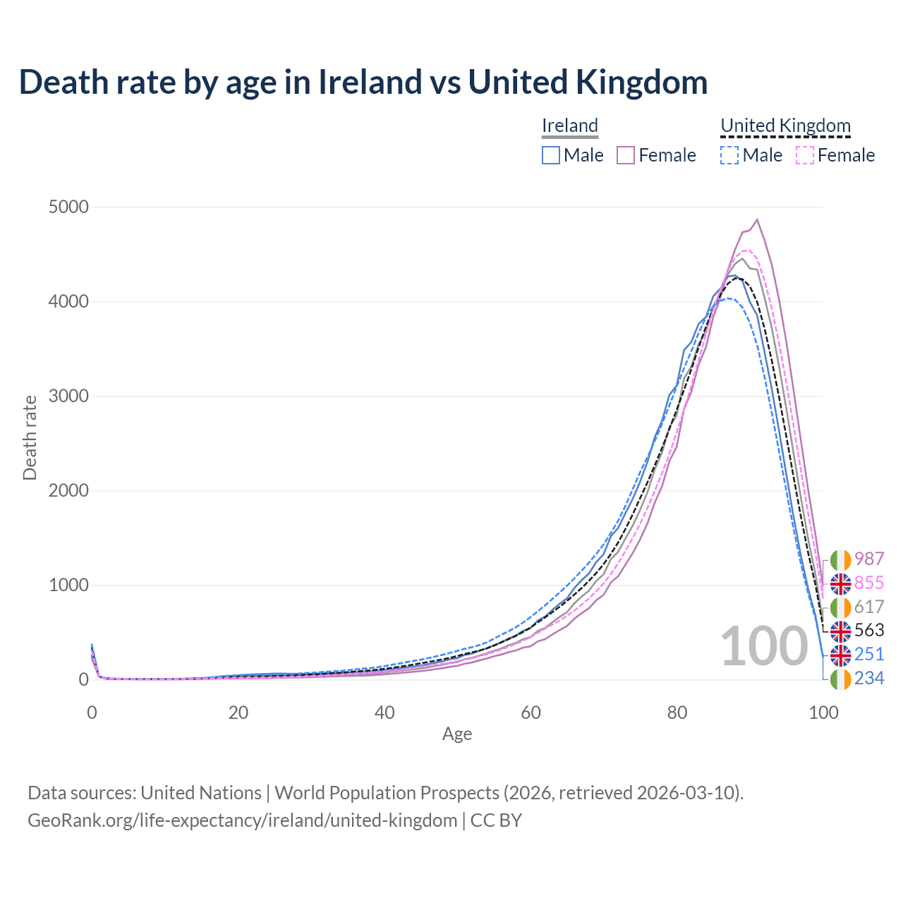 In Ireland, the most common age of death is 89, compared to 88 in the United Kingdom. The median age of death is 85.7 in Ireland and 84.9 in the United Kingdom, meaning only half of each cohort is expected to live past that age.