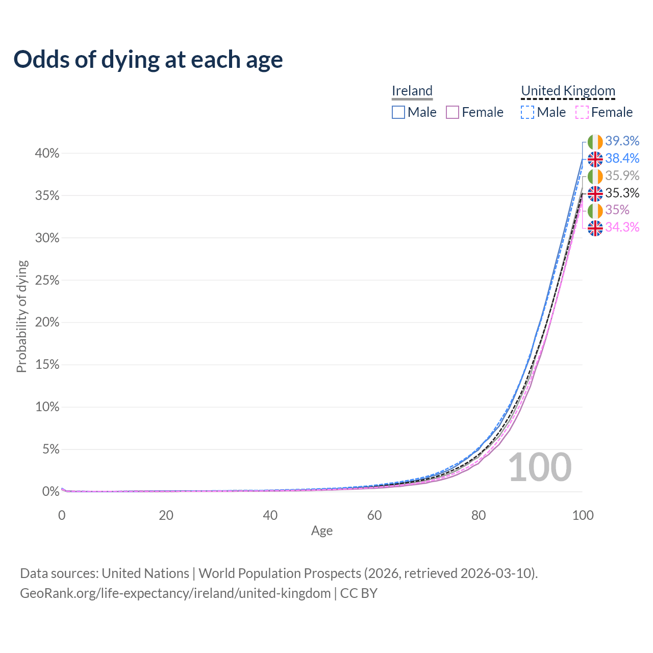 This life expectancy calculator shows the odds of living to 100, 95, 90, and below based on current age for both males and females in Ireland and the United Kingdom, along with mean and median age of death. The calculations are based on the 2026 life tables (actuarial tables) from the UN World Population Prospects.