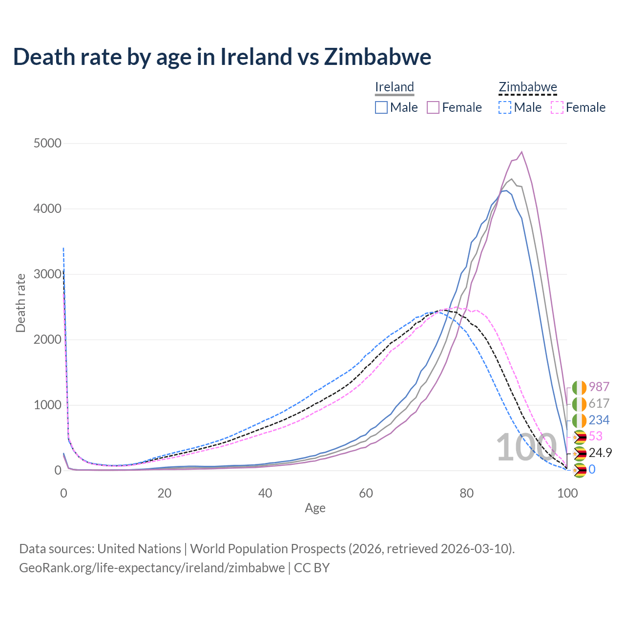 In Ireland, the most common age of death is 89, compared to 0 in Zimbabwe. The median age of death is 85.7 in Ireland and 68.8 in Zimbabwe, meaning only half of each cohort is expected to live past that age.