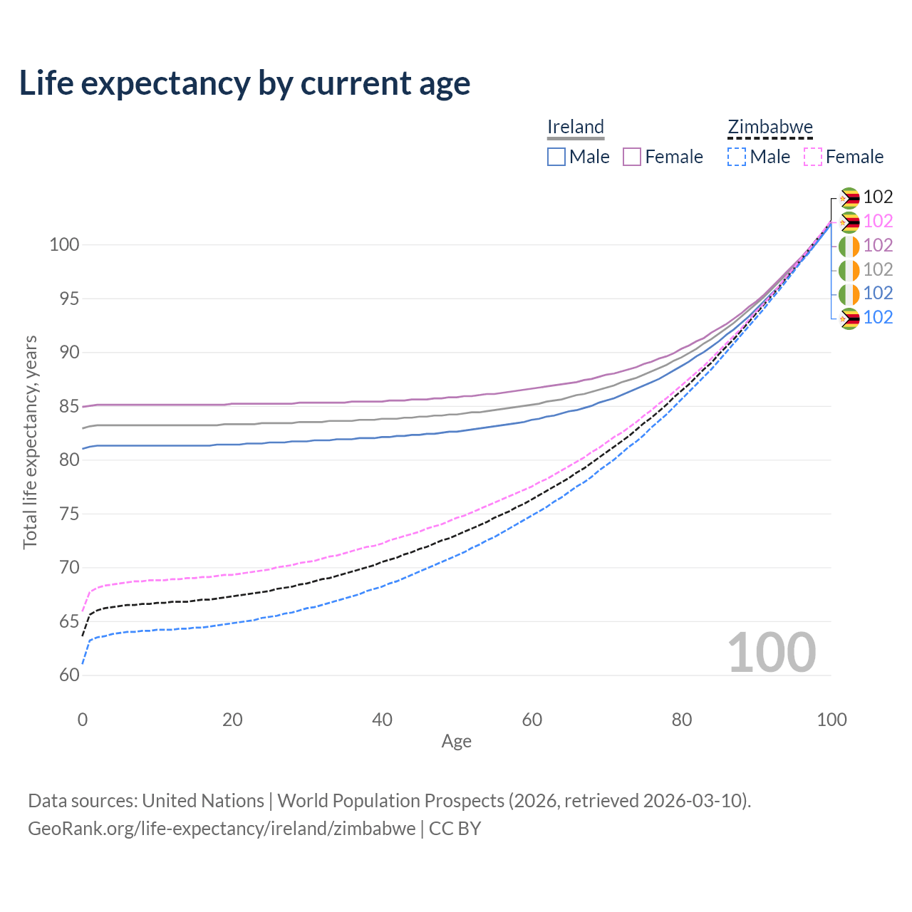 The average life expectancy at birth is 82.9 years in Ireland vs 63.6 in Zimbabwe. Ireland is ranked 20/197 by life expectancy, and Zimbabwe is 180/197. In Ireland, the life expectancy is 81 years for males and 84.9 years for females. In Zimbabwe, it's 61 years for males and 65.9 years for females.