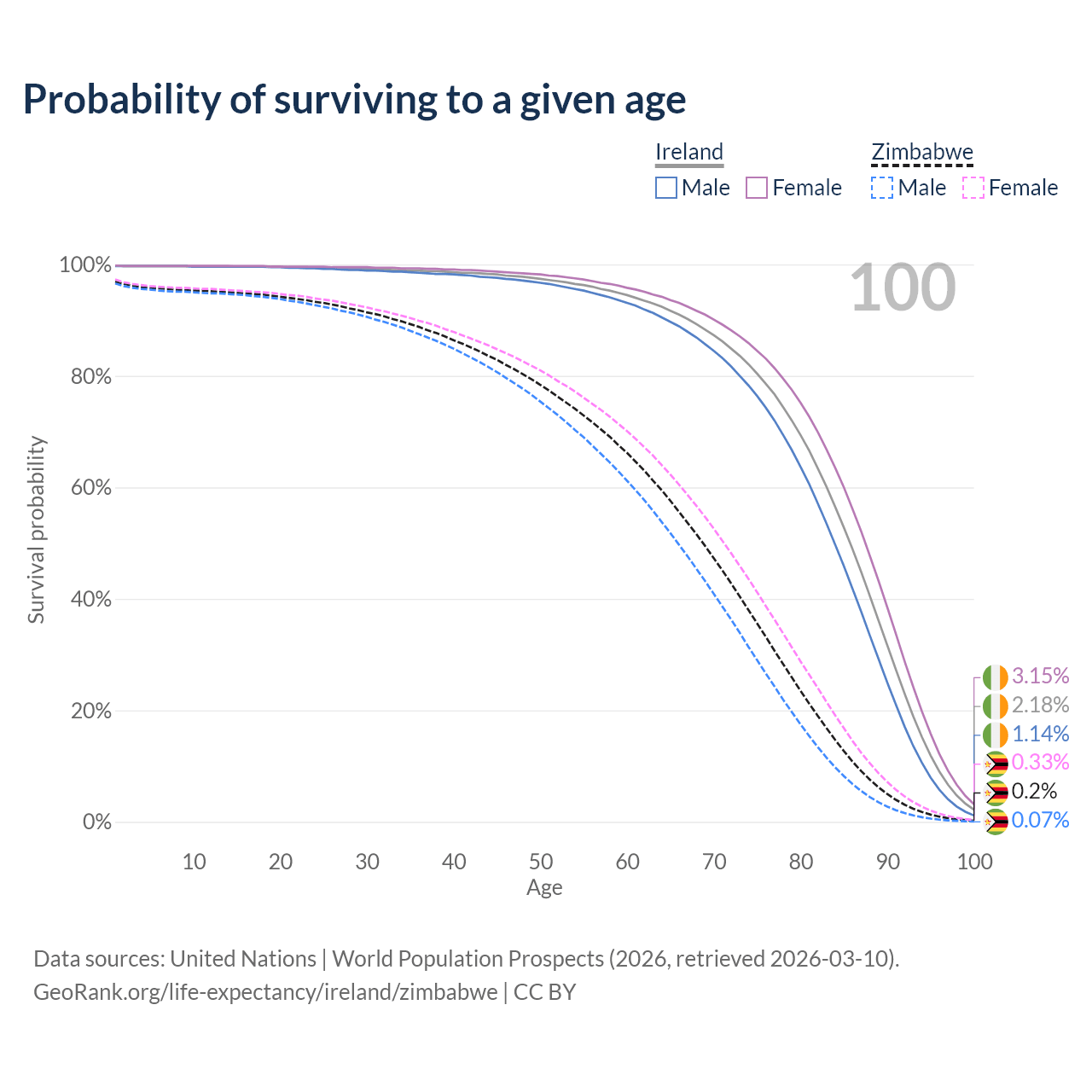 This life expectancy calculator shows the odds of living to 100, 95, 90, and below based on current age for both males and females in Ireland and Zimbabwe, along with mean and median age of death. The calculations are based on the 2026 life tables (actuarial tables) from the UN World Population Prospects.