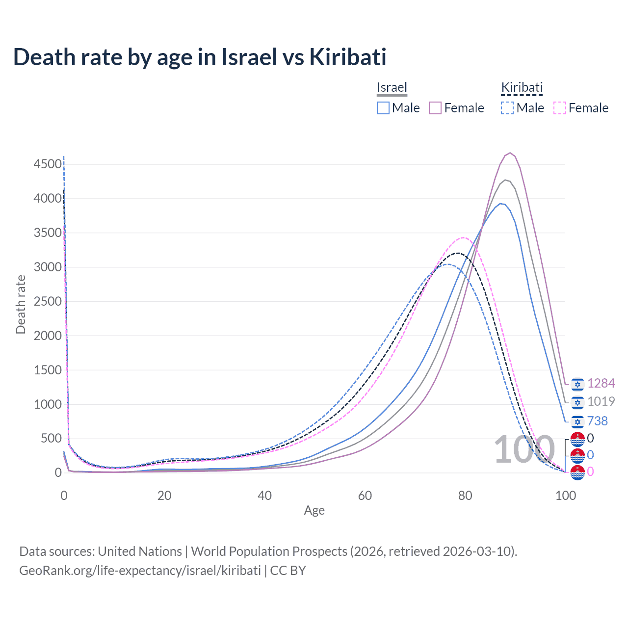 In Israel, the most common age of death is 88, compared to 0 in Kiribati. The median age of death is 85.6 in Israel and 73.1 in Kiribati, meaning only half of each cohort is expected to live past that age.