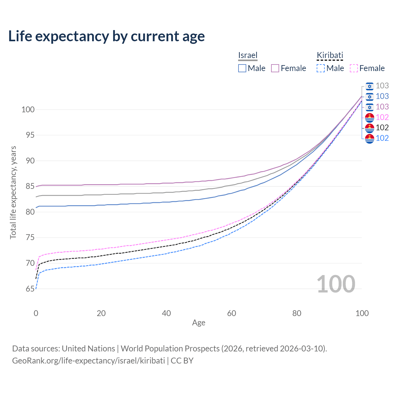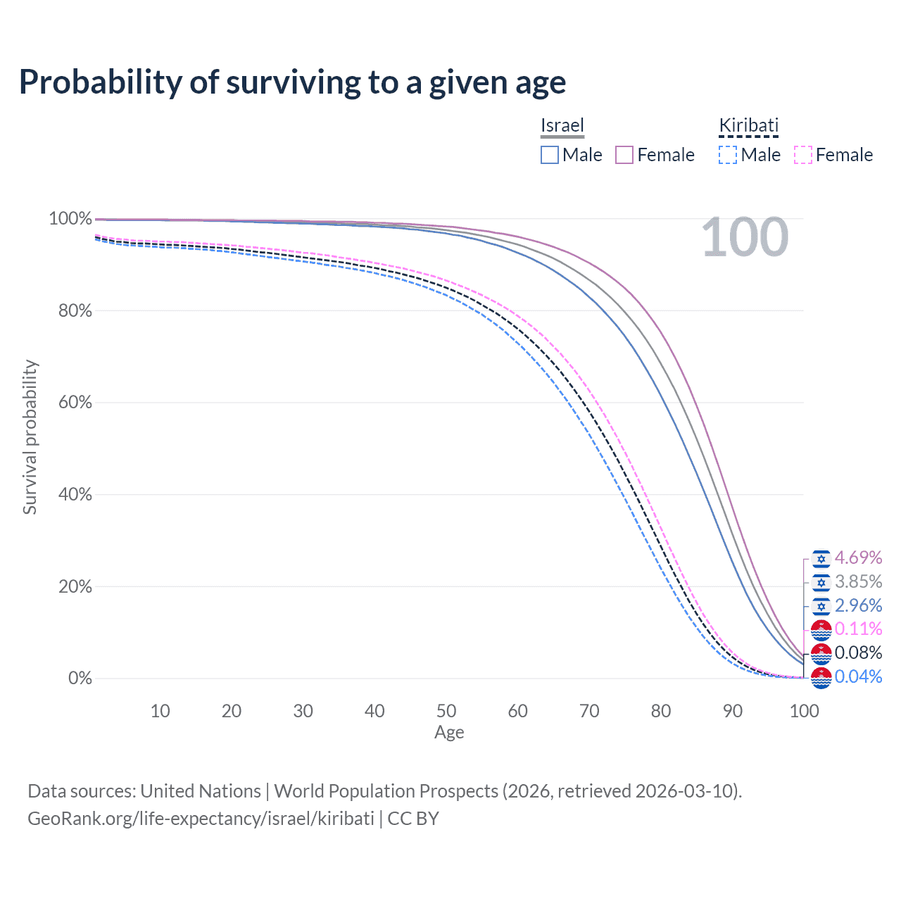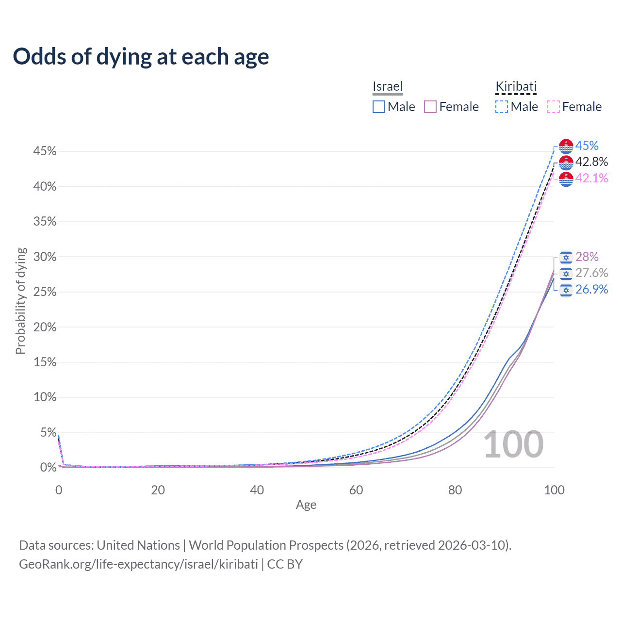 This life expectancy calculator shows the odds of living to 100, 95, 90, and below based on current age for both males and females in Israel and Kiribati, along with mean and median age of death. The calculations are based on the 2026 life tables (actuarial tables) from the UN World Population Prospects.