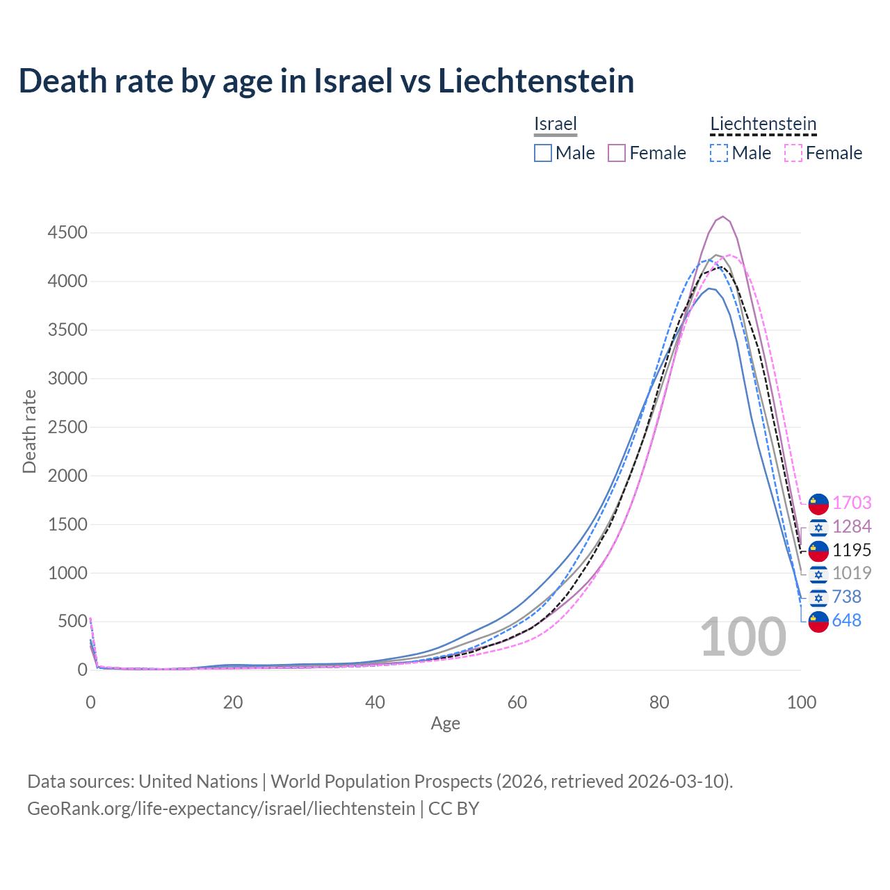 In Israel, the most common age of death is 88, compared to 89 in Liechtenstein. The median age of death is 85.6 in Israel and 86.3 in Liechtenstein, meaning only half of each cohort is expected to live past that age.