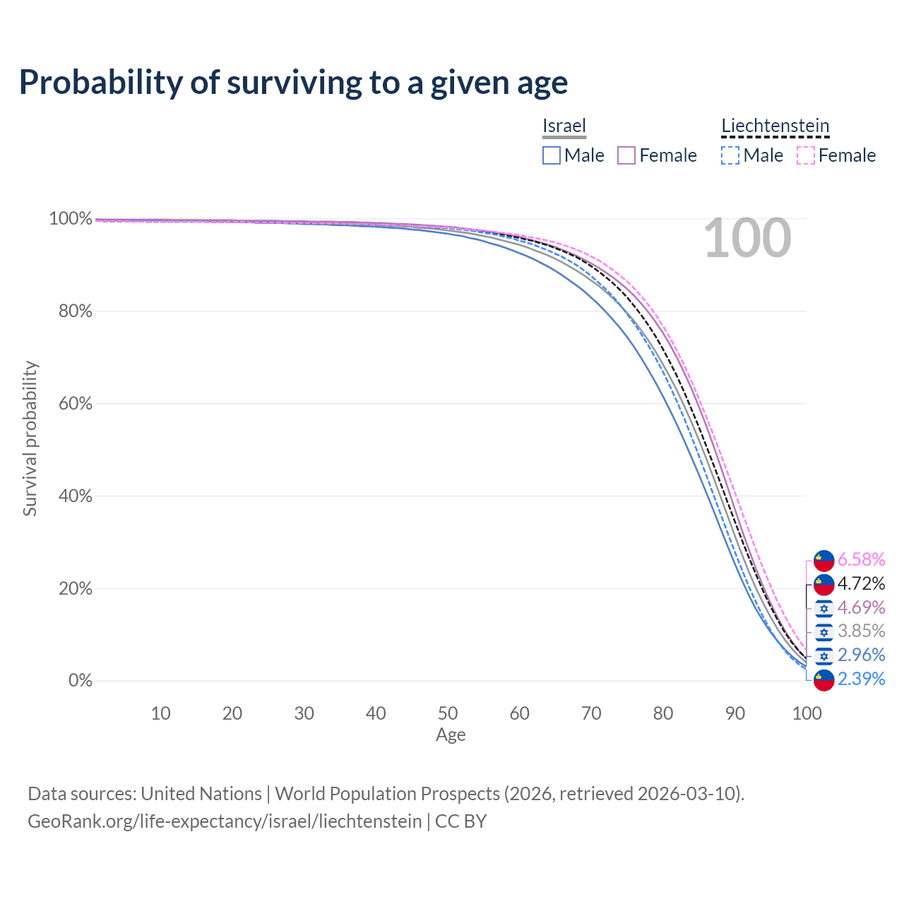 This life expectancy calculator shows the odds of living to 100, 95, 90, and below based on current age for both males and females in Israel and Liechtenstein, along with mean and median age of death. The calculations are based on the 2026 life tables (actuarial tables) from the UN World Population Prospects.