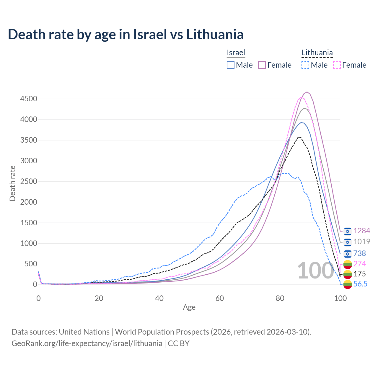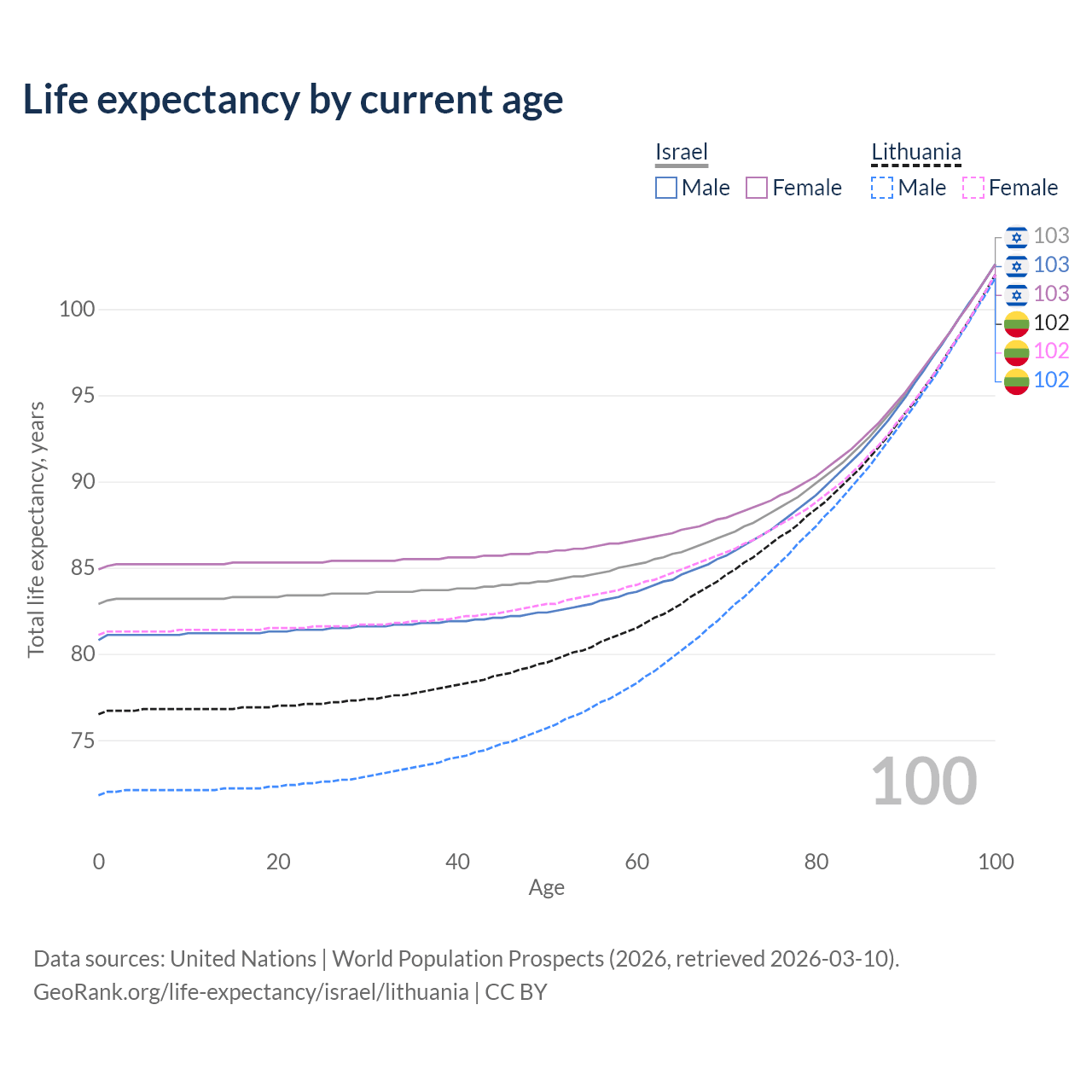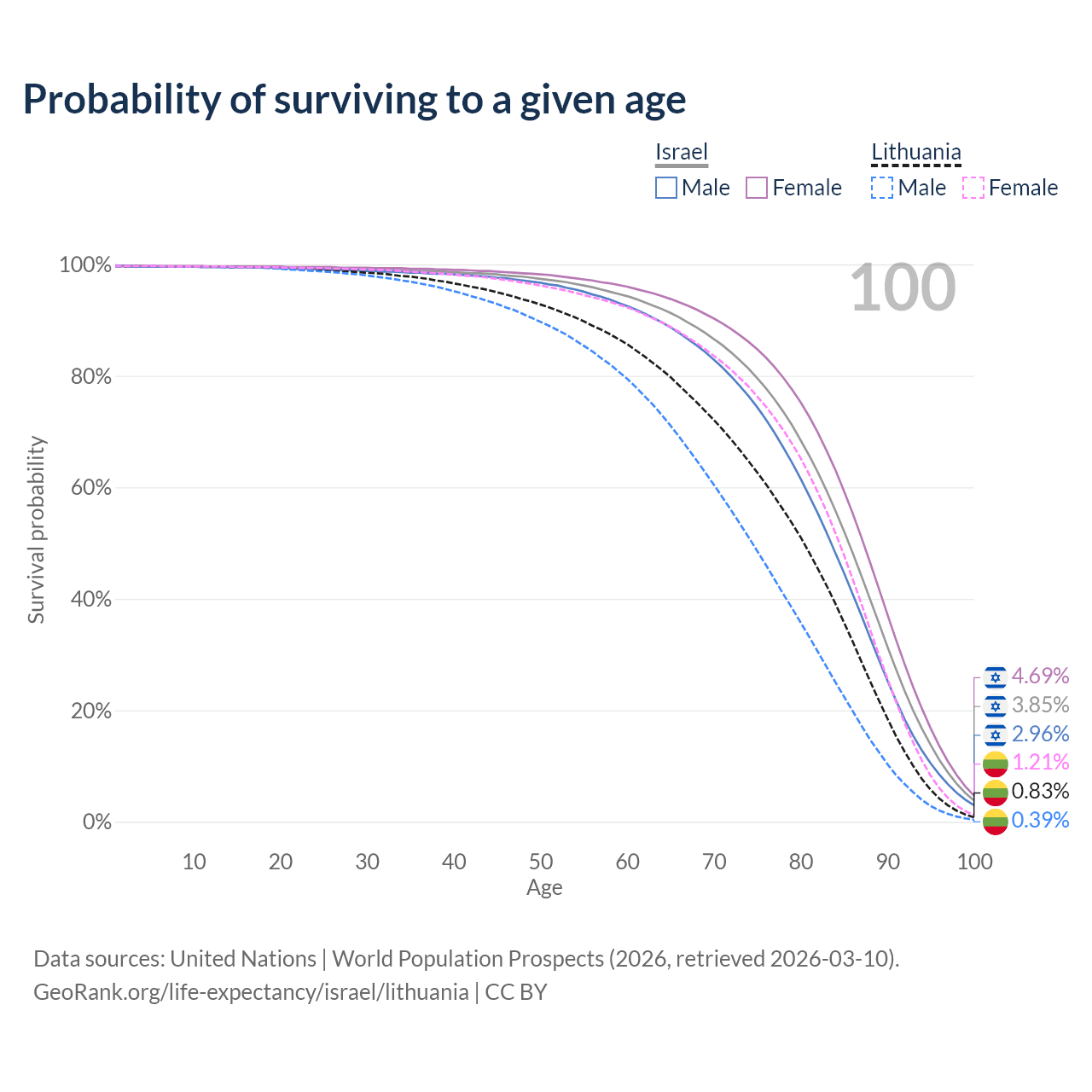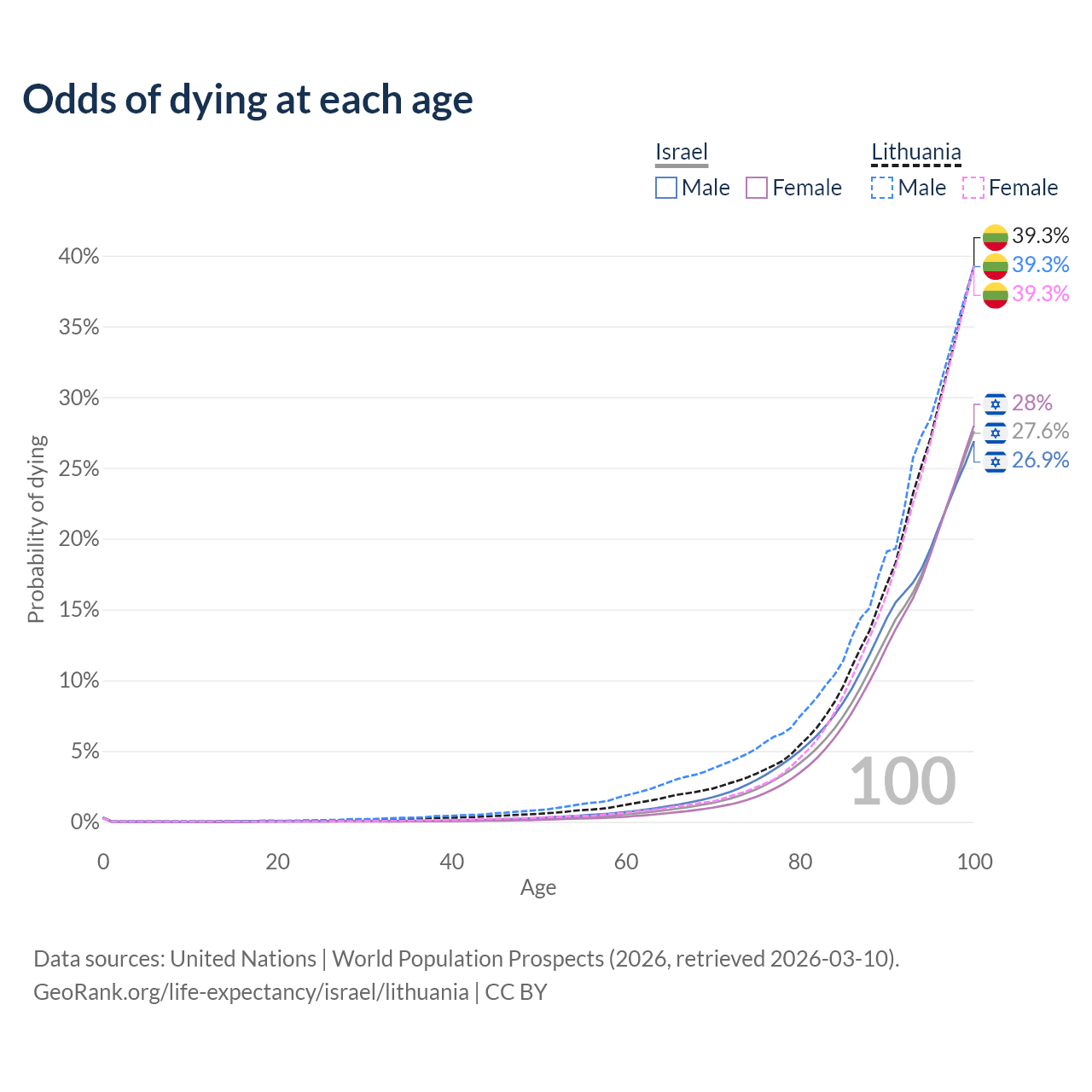 This life expectancy calculator shows the odds of living to 100, 95, 90, and below based on current age for both males and females in Israel and Lithuania, along with mean and median age of death. The calculations are based on the 2026 life tables (actuarial tables) from the UN World Population Prospects.