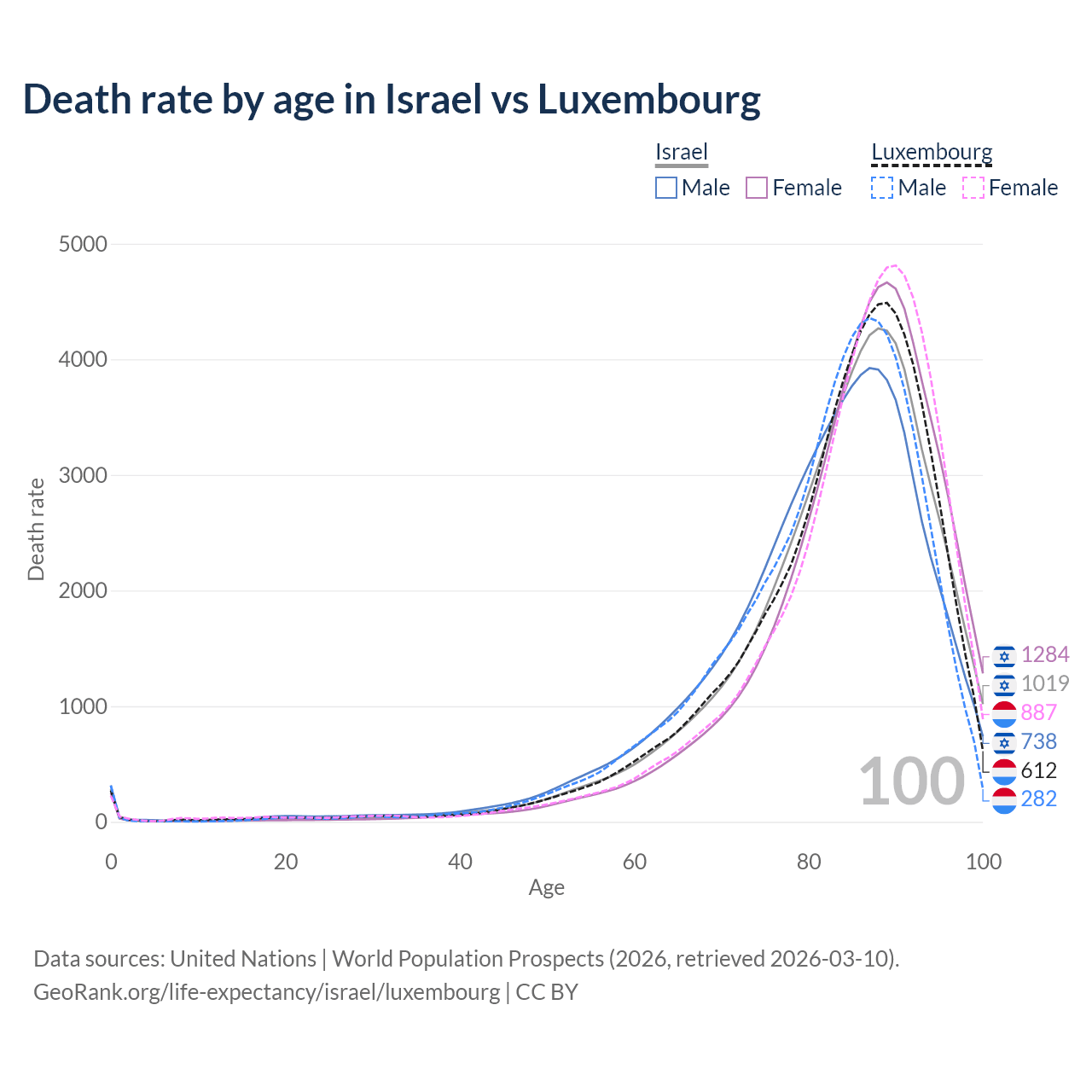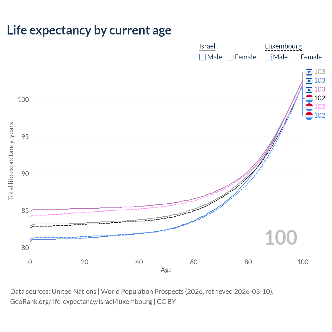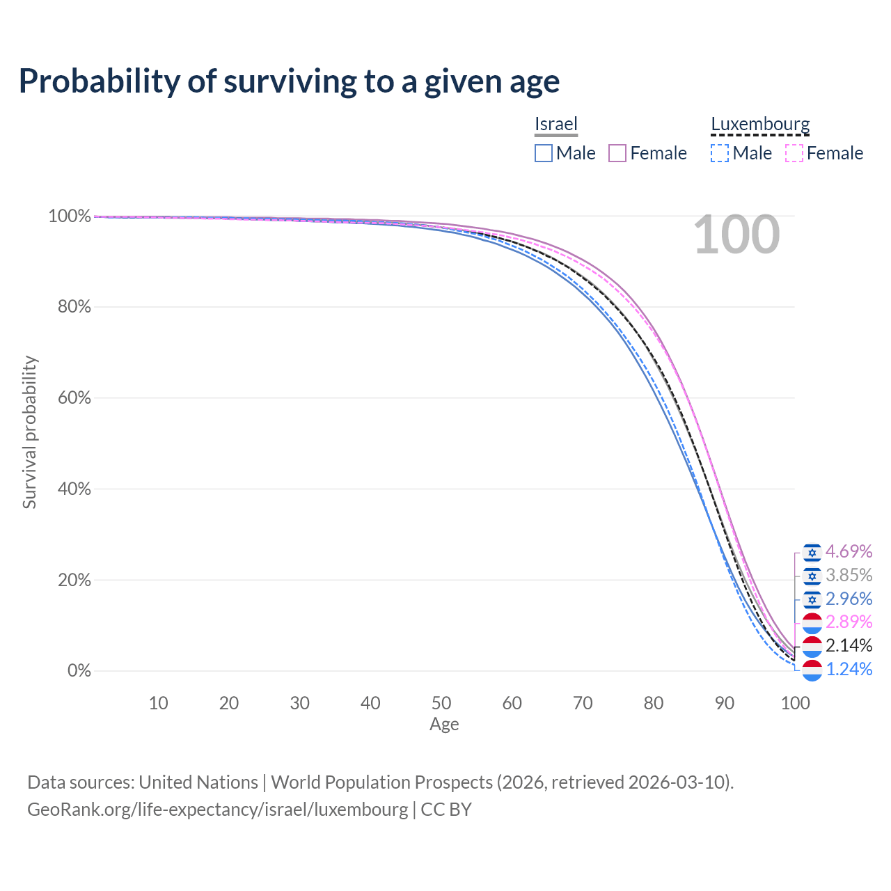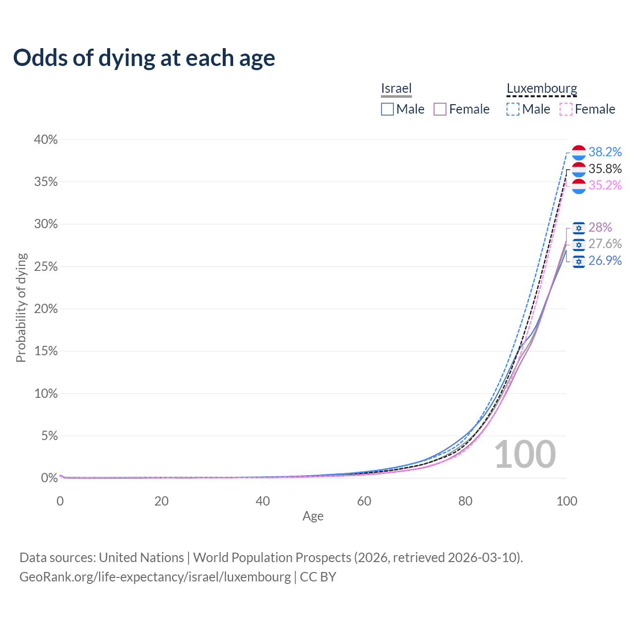 This life expectancy calculator shows the odds of living to 100, 95, 90, and below based on current age for both males and females in Israel and Luxembourg, along with mean and median age of death. The calculations are based on the 2026 life tables (actuarial tables) from the UN World Population Prospects.