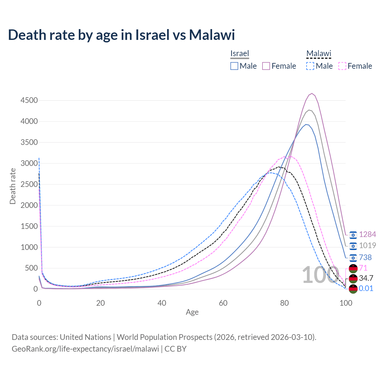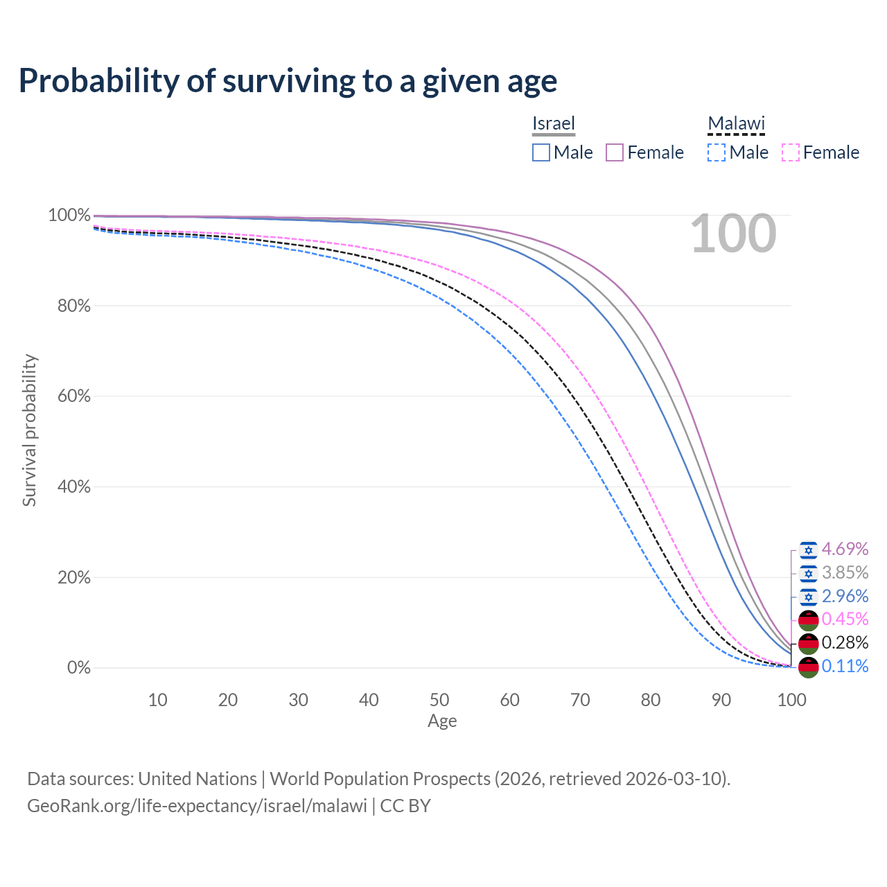This life expectancy calculator shows the odds of living to 100, 95, 90, and below based on current age for both males and females in Israel and Malawi, along with mean and median age of death. The calculations are based on the 2026 life tables (actuarial tables) from the UN World Population Prospects.
