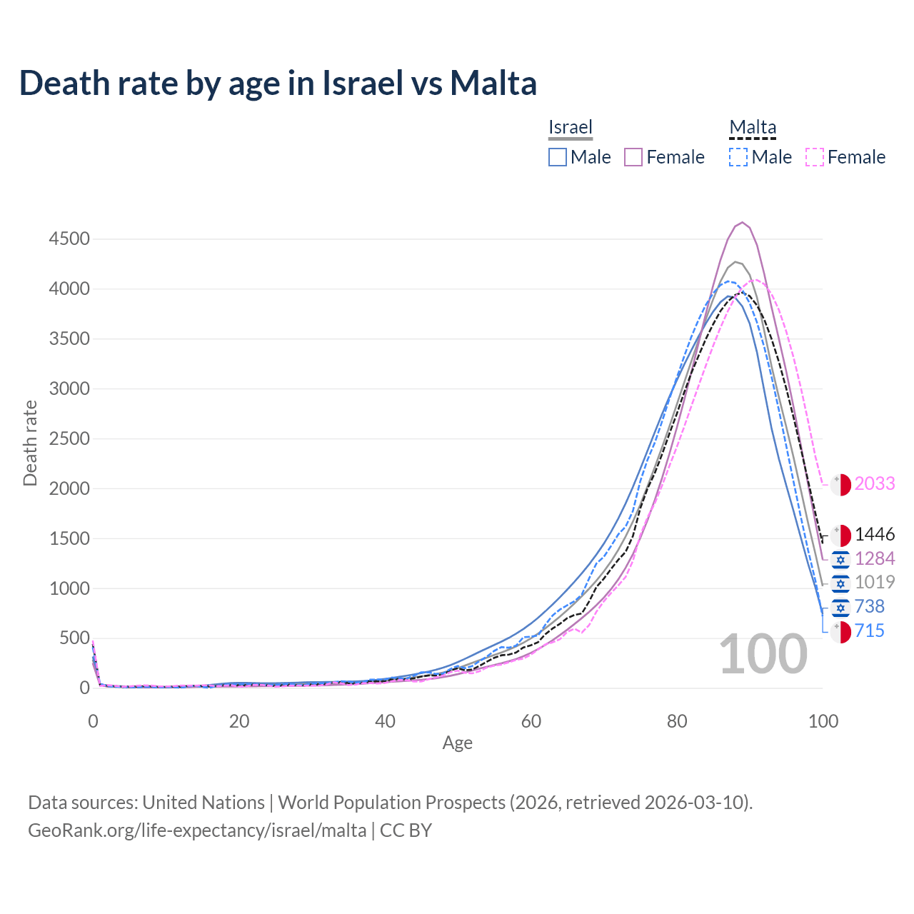 In Israel, the most common age of death is 88, compared to 89 in Malta. The median age of death is 85.6 in Israel and 86.3 in Malta, meaning only half of each cohort is expected to live past that age.