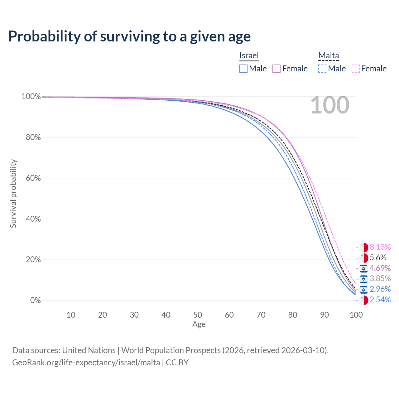This life expectancy calculator shows the odds of living to 100, 95, 90, and below based on current age for both males and females in Israel and Malta, along with mean and median age of death. The calculations are based on the 2026 life tables (actuarial tables) from the UN World Population Prospects.