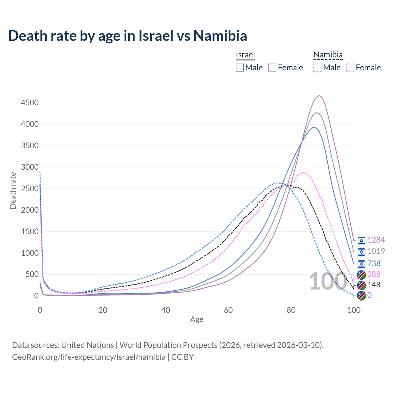 In Israel, the most common age of death is 88, compared to 0 in Namibia. The median age of death is 85.6 in Israel and 72.7 in Namibia, meaning only half of each cohort is expected to live past that age.