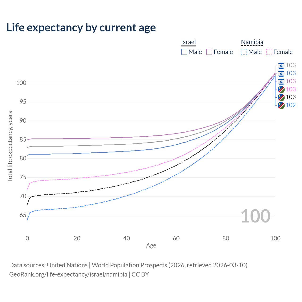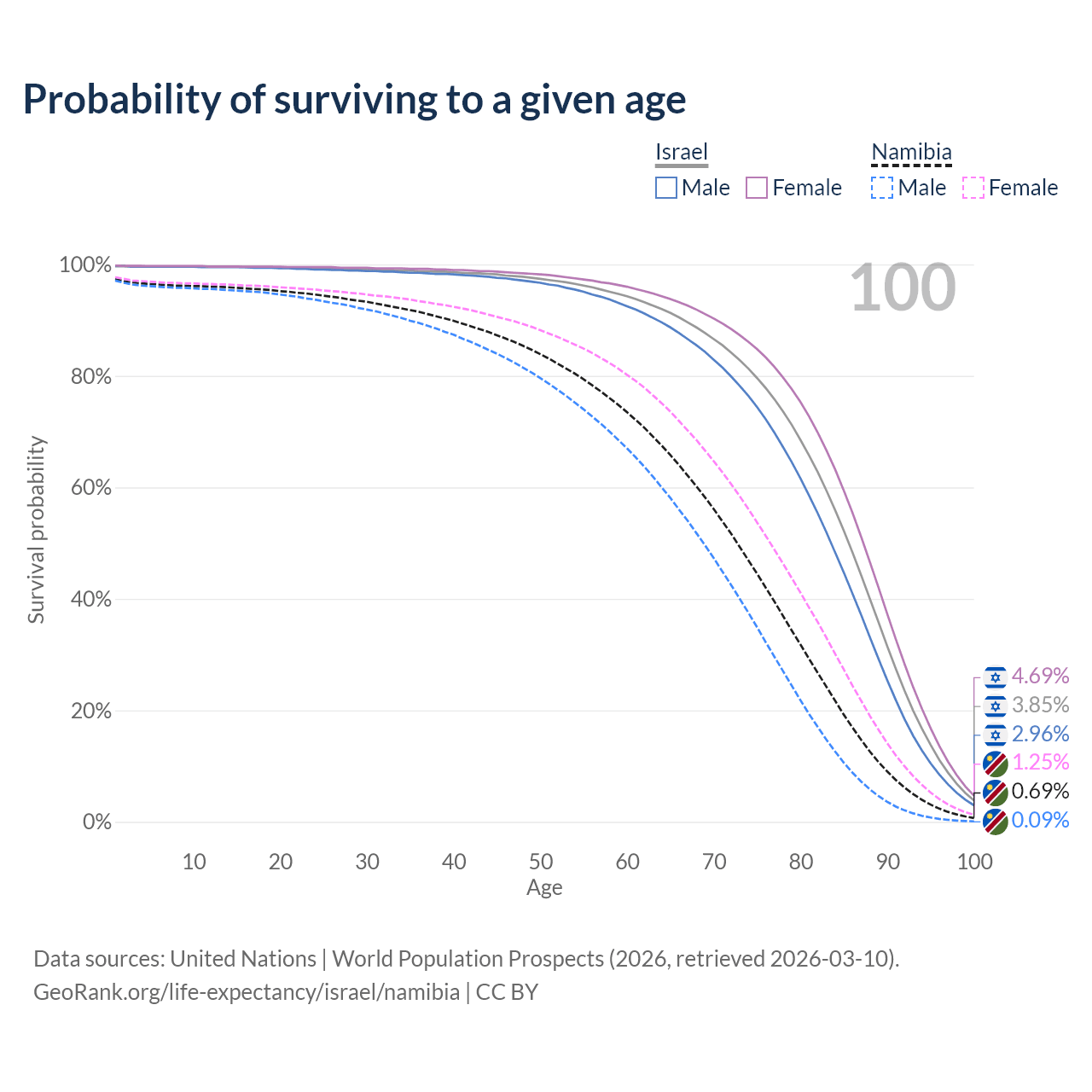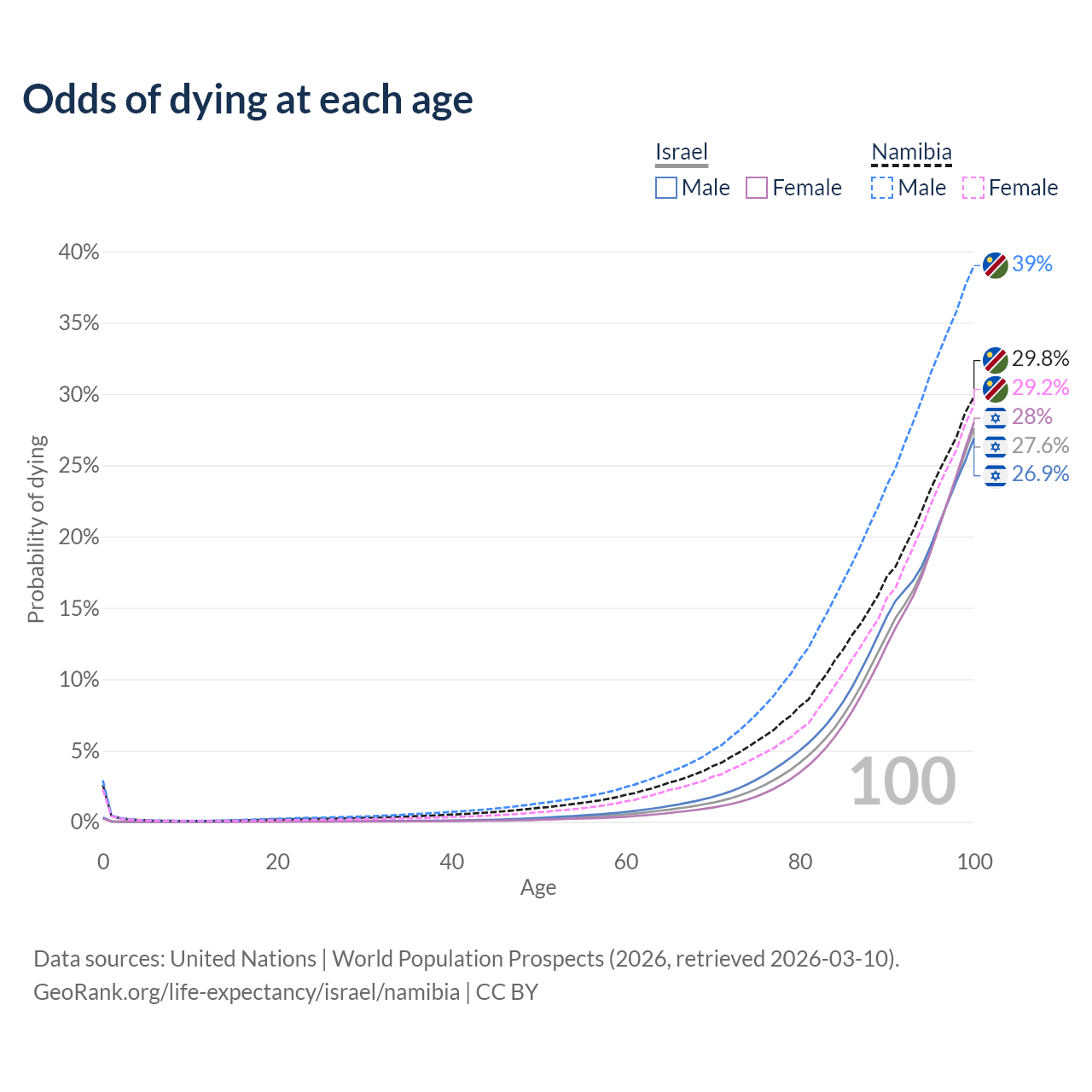 This life expectancy calculator shows the odds of living to 100, 95, 90, and below based on current age for both males and females in Israel and Namibia, along with mean and median age of death. The calculations are based on the 2026 life tables (actuarial tables) from the UN World Population Prospects.