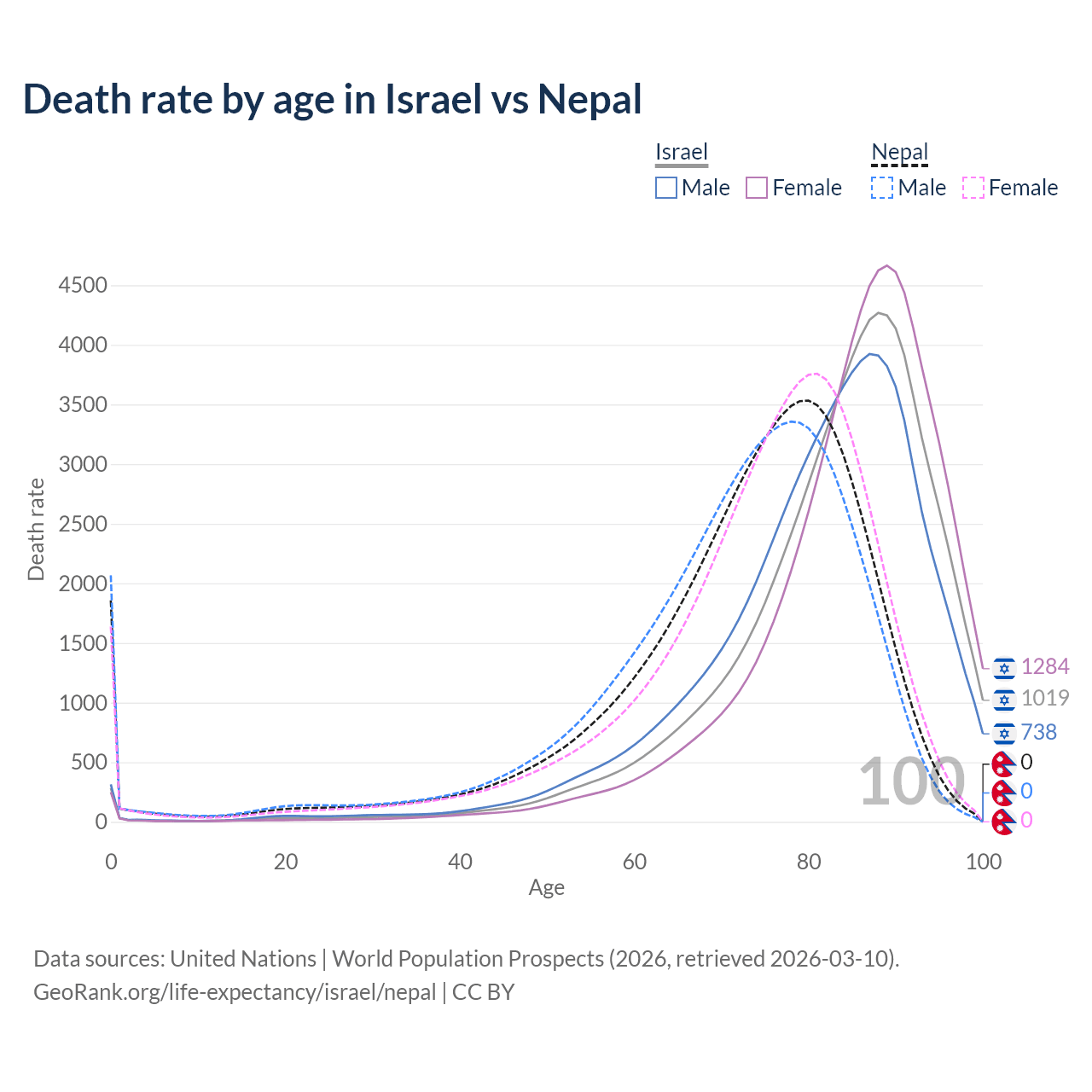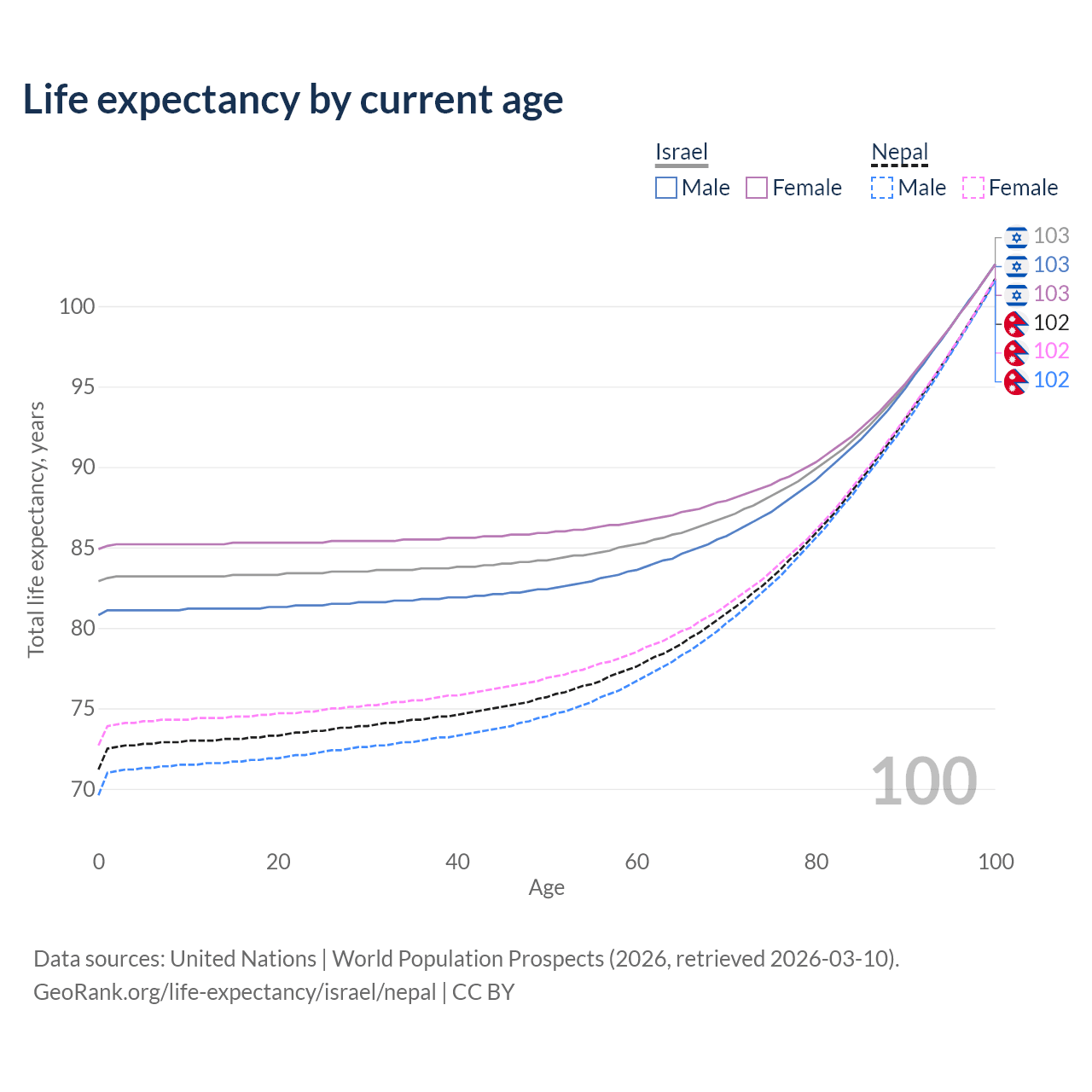 This life expectancy calculator shows the odds of living to 100, 95, 90, and below based on current age for both males and females in Israel and Nepal, along with mean and median age of death. The calculations are based on the 2026 life tables (actuarial tables) from the UN World Population Prospects.