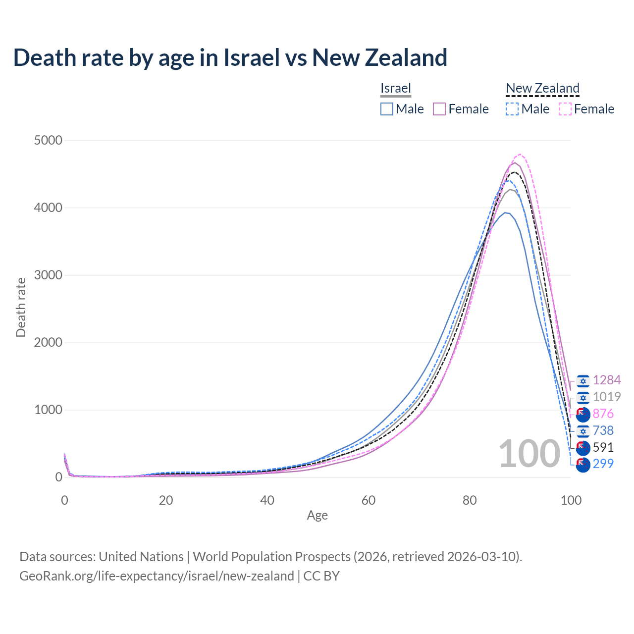 In Israel, the most common age of death is 88, compared to 89 in New Zealand. The median age of death is 85.6 in Israel and 85.8 in New Zealand, meaning only half of each cohort is expected to live past that age.