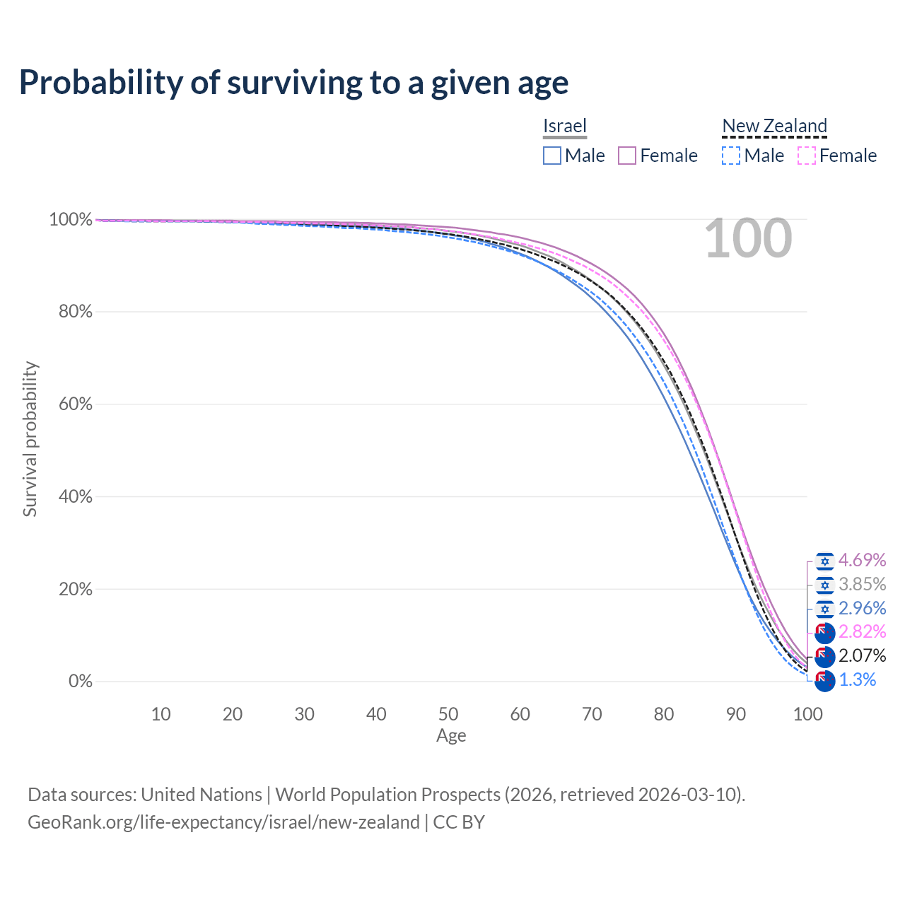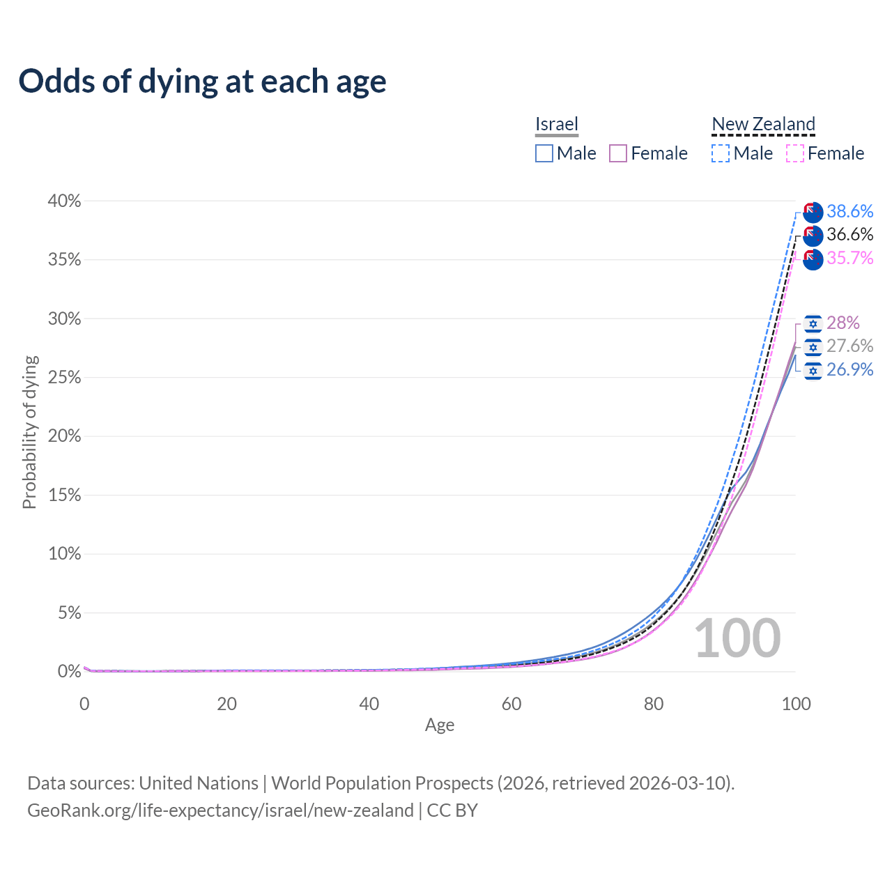 This life expectancy calculator shows the odds of living to 100, 95, 90, and below based on current age for both males and females in Israel and New Zealand, along with mean and median age of death. The calculations are based on the 2026 life tables (actuarial tables) from the UN World Population Prospects.