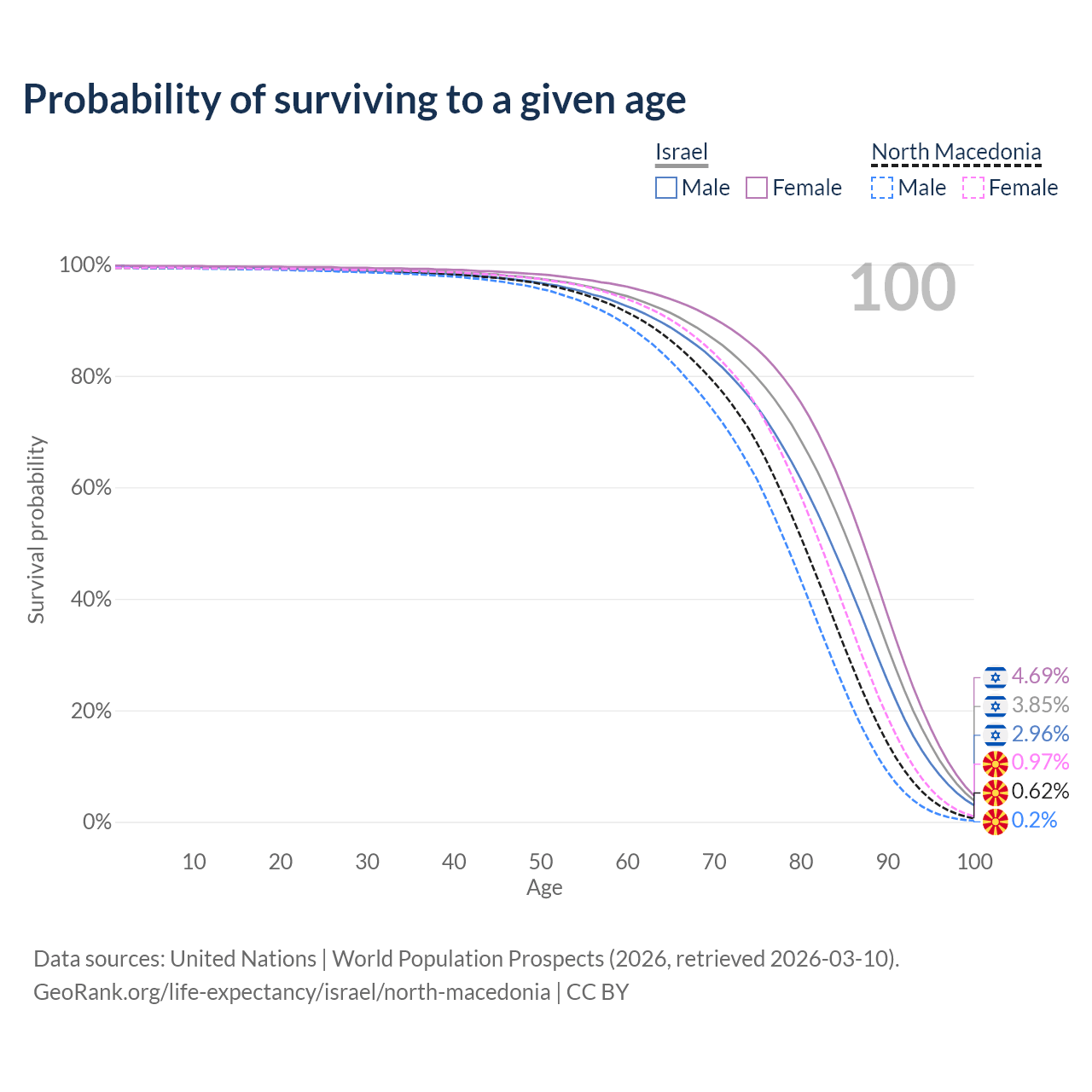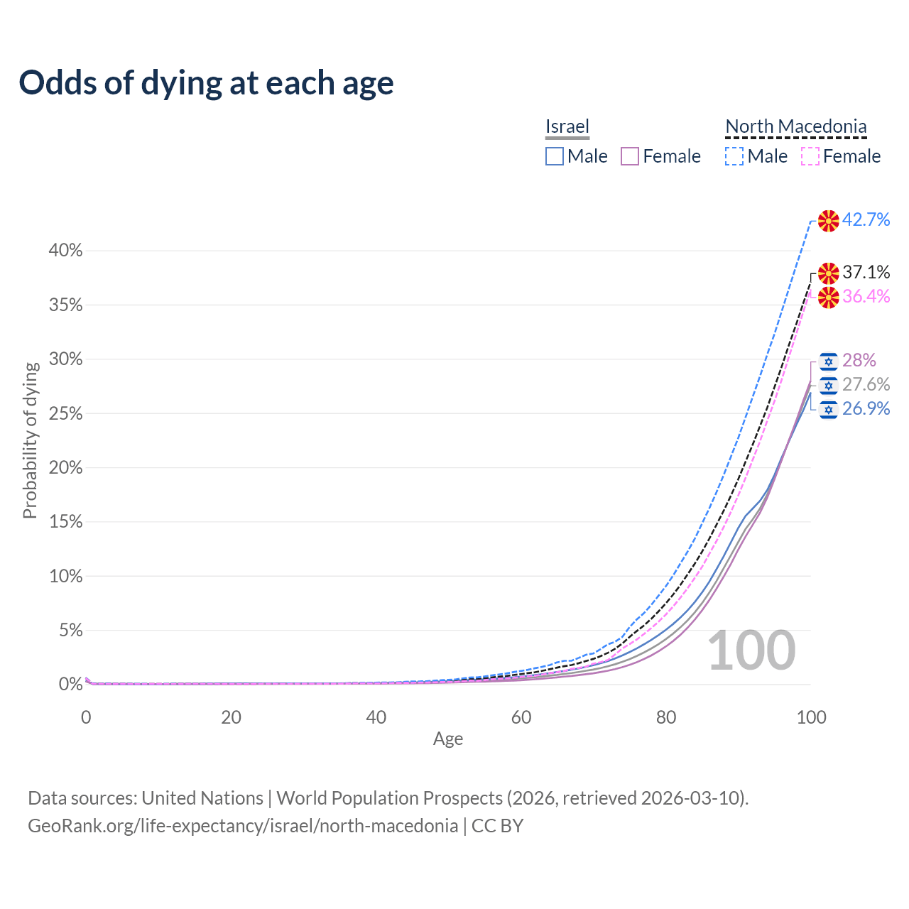 This life expectancy calculator shows the odds of living to 100, 95, 90, and below based on current age for both males and females in Israel and North Macedonia, along with mean and median age of death. The calculations are based on the 2026 life tables (actuarial tables) from the UN World Population Prospects.
