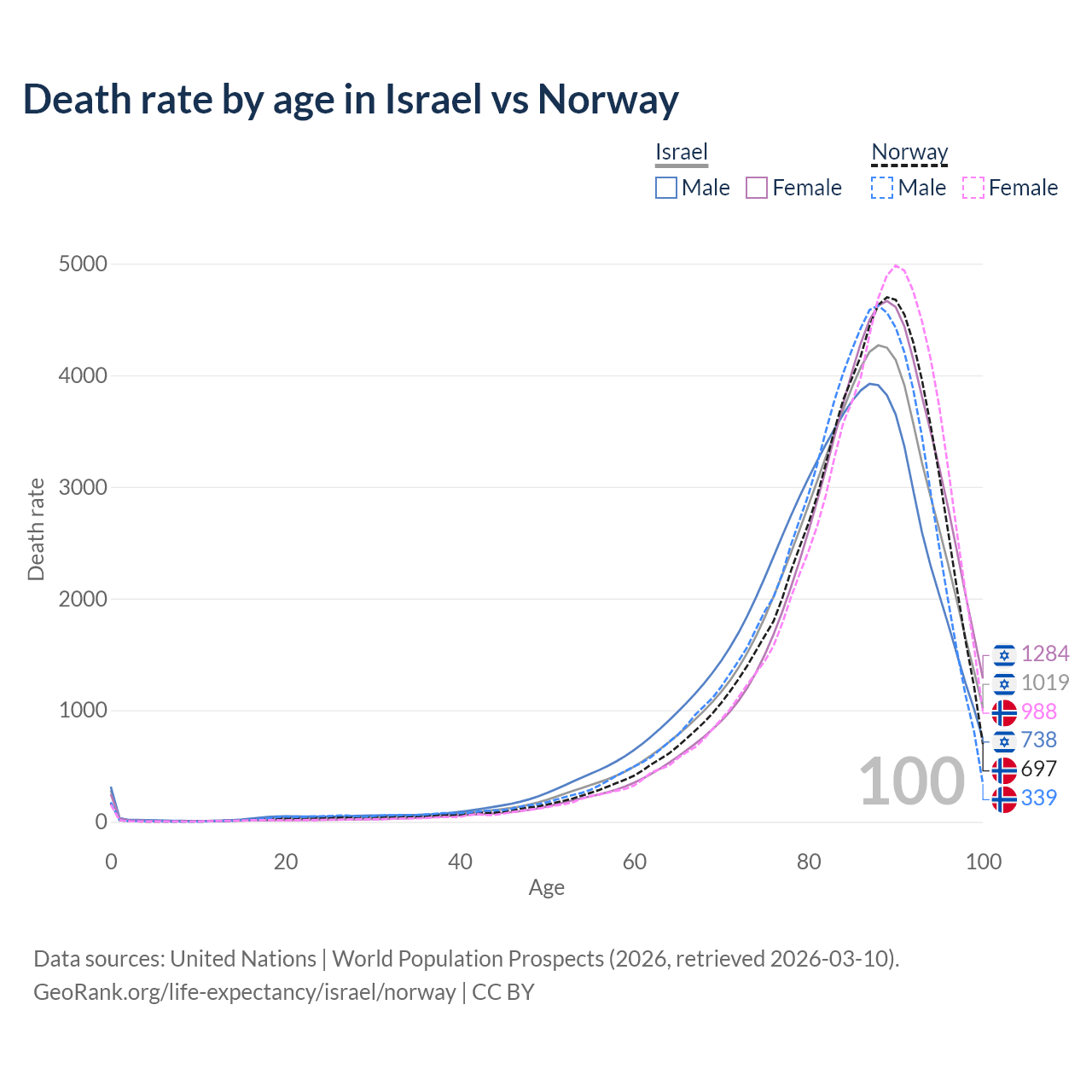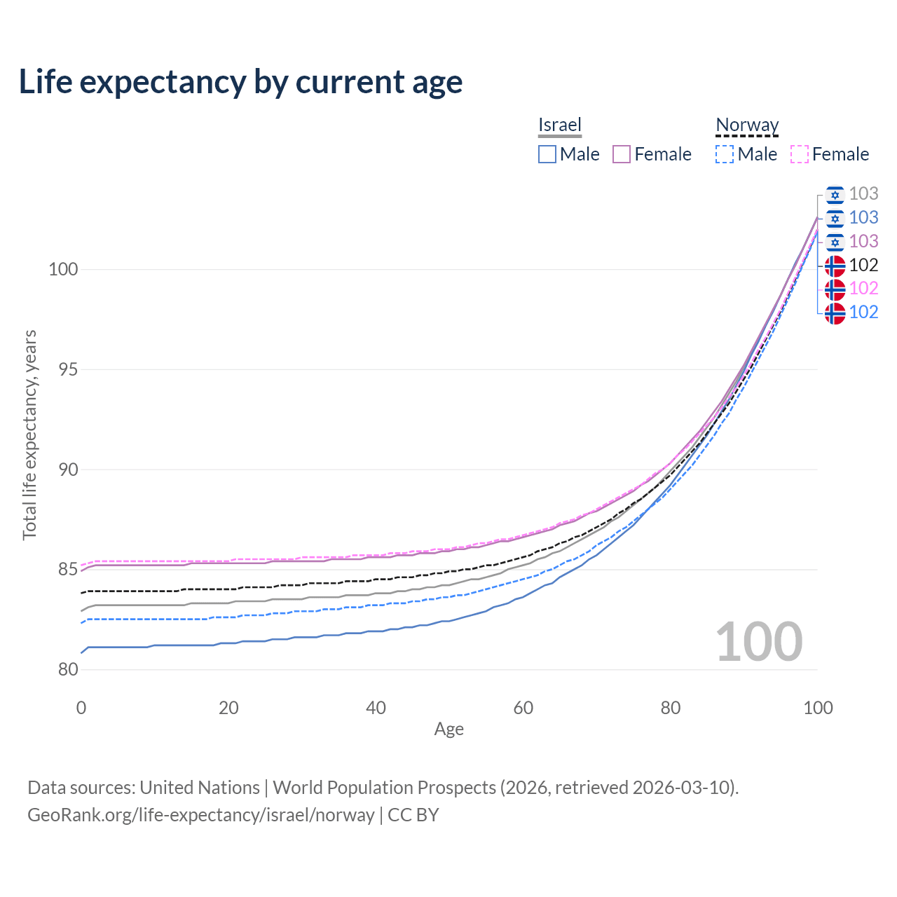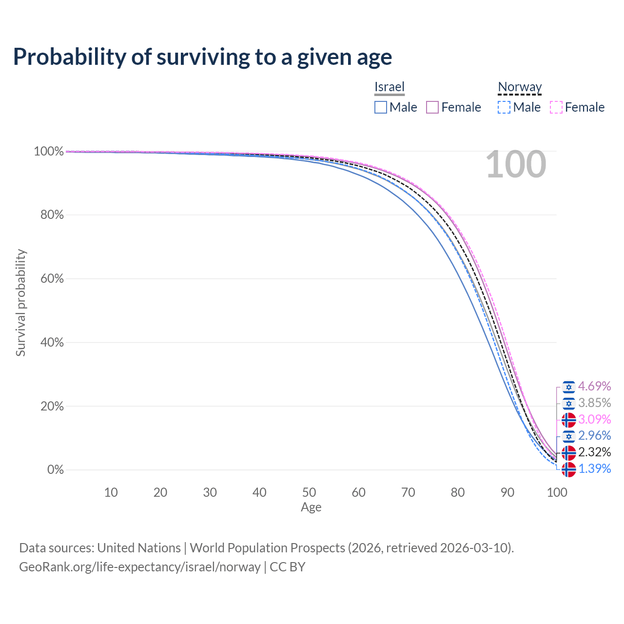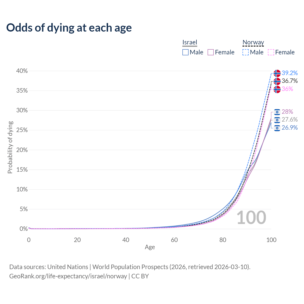 This life expectancy calculator shows the odds of living to 100, 95, 90, and below based on current age for both males and females in Israel and Norway, along with mean and median age of death. The calculations are based on the 2026 life tables (actuarial tables) from the UN World Population Prospects.