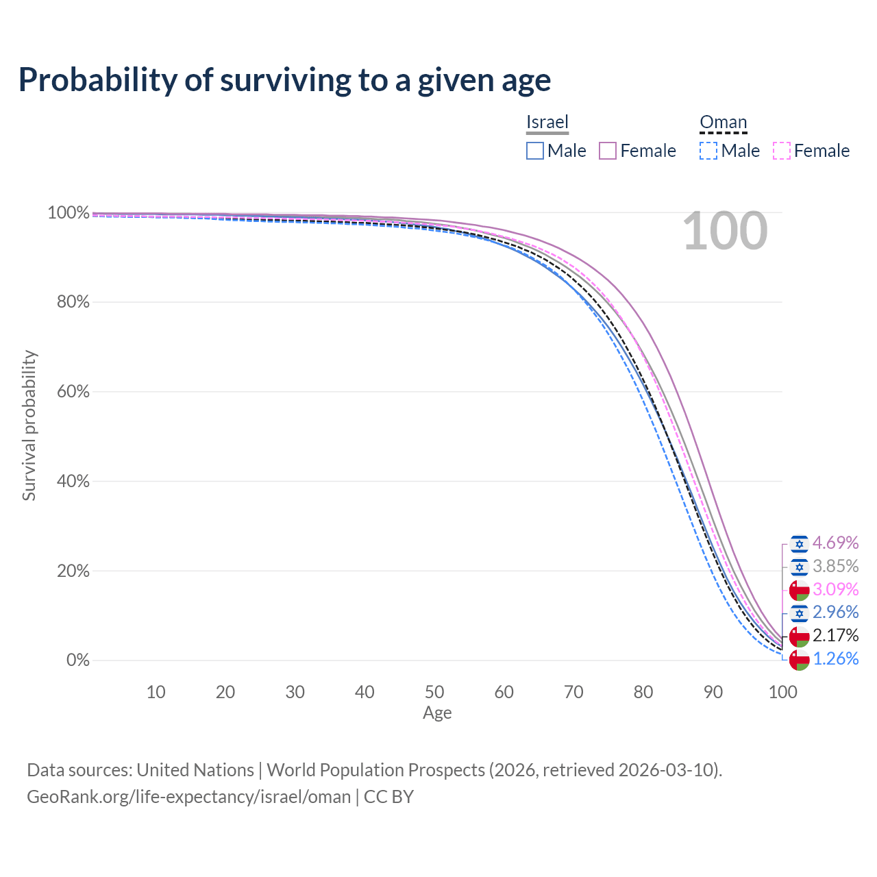 This life expectancy calculator shows the odds of living to 100, 95, 90, and below based on current age for both males and females in Israel and Oman, along with mean and median age of death. The calculations are based on the 2026 life tables (actuarial tables) from the UN World Population Prospects.