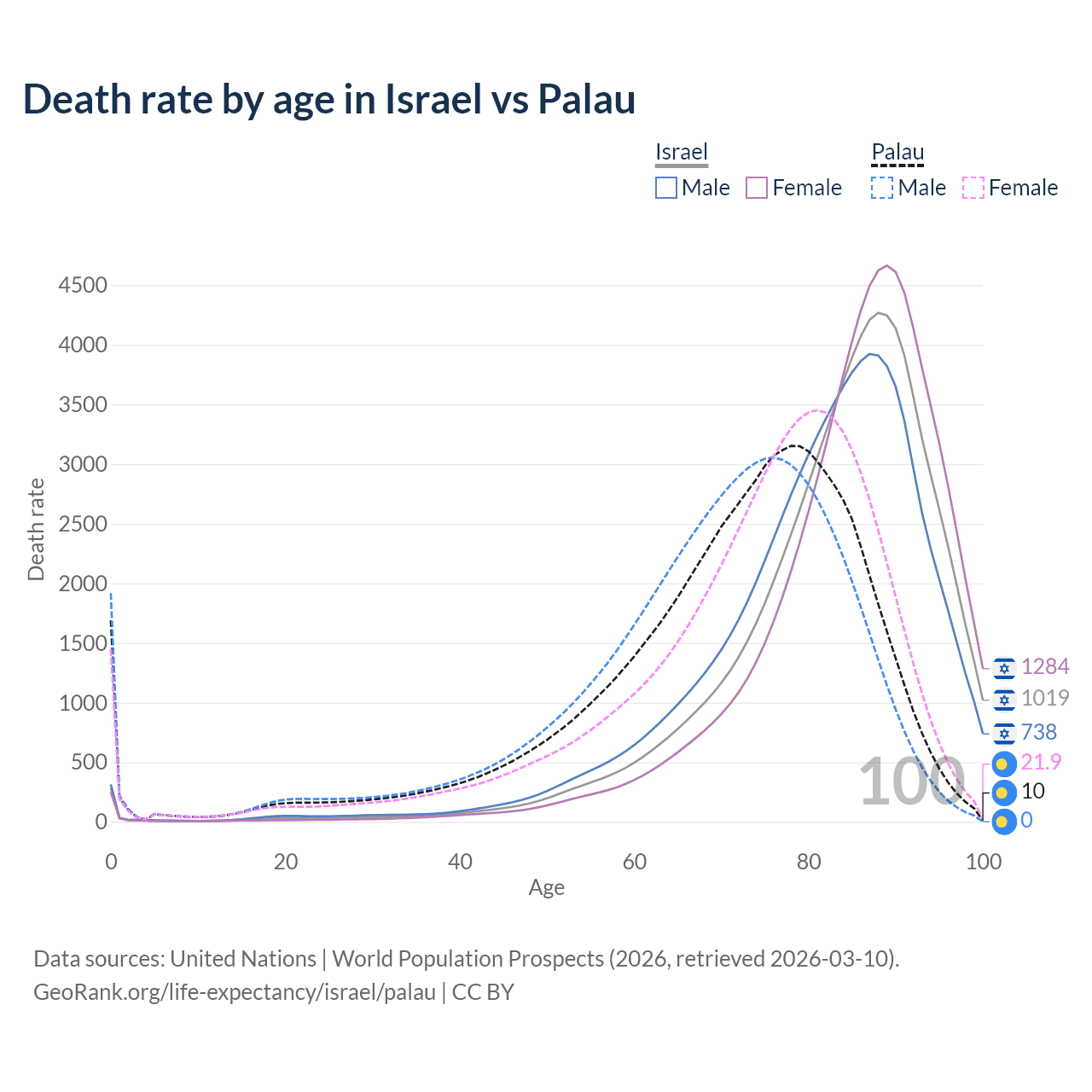 In Israel, the most common age of death is 88, compared to 78 in Palau. The median age of death is 85.6 in Israel and 73.8 in Palau, meaning only half of each cohort is expected to live past that age.