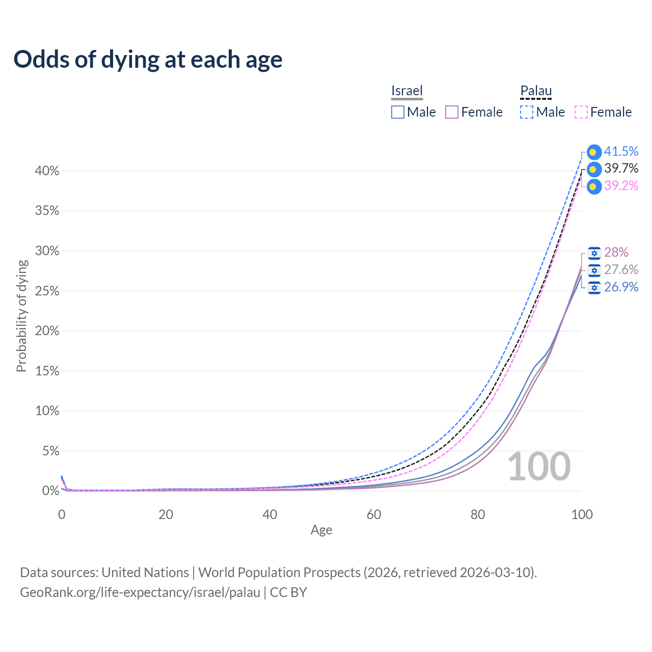 This life expectancy calculator shows the odds of living to 100, 95, 90, and below based on current age for both males and females in Israel and Palau, along with mean and median age of death. The calculations are based on the 2026 life tables (actuarial tables) from the UN World Population Prospects.