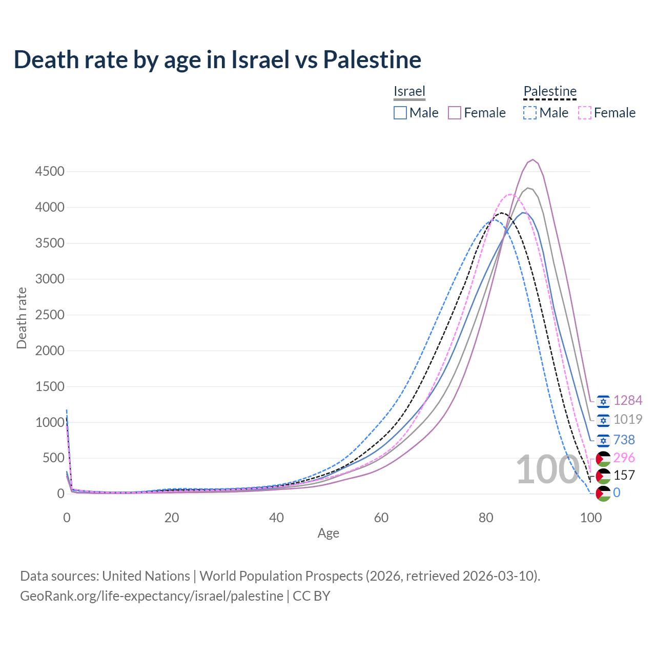 In Israel, the most common age of death is 88, compared to 83 in Palestine. The median age of death is 85.6 in Israel and 80.5 in Palestine, meaning only half of each cohort is expected to live past that age.