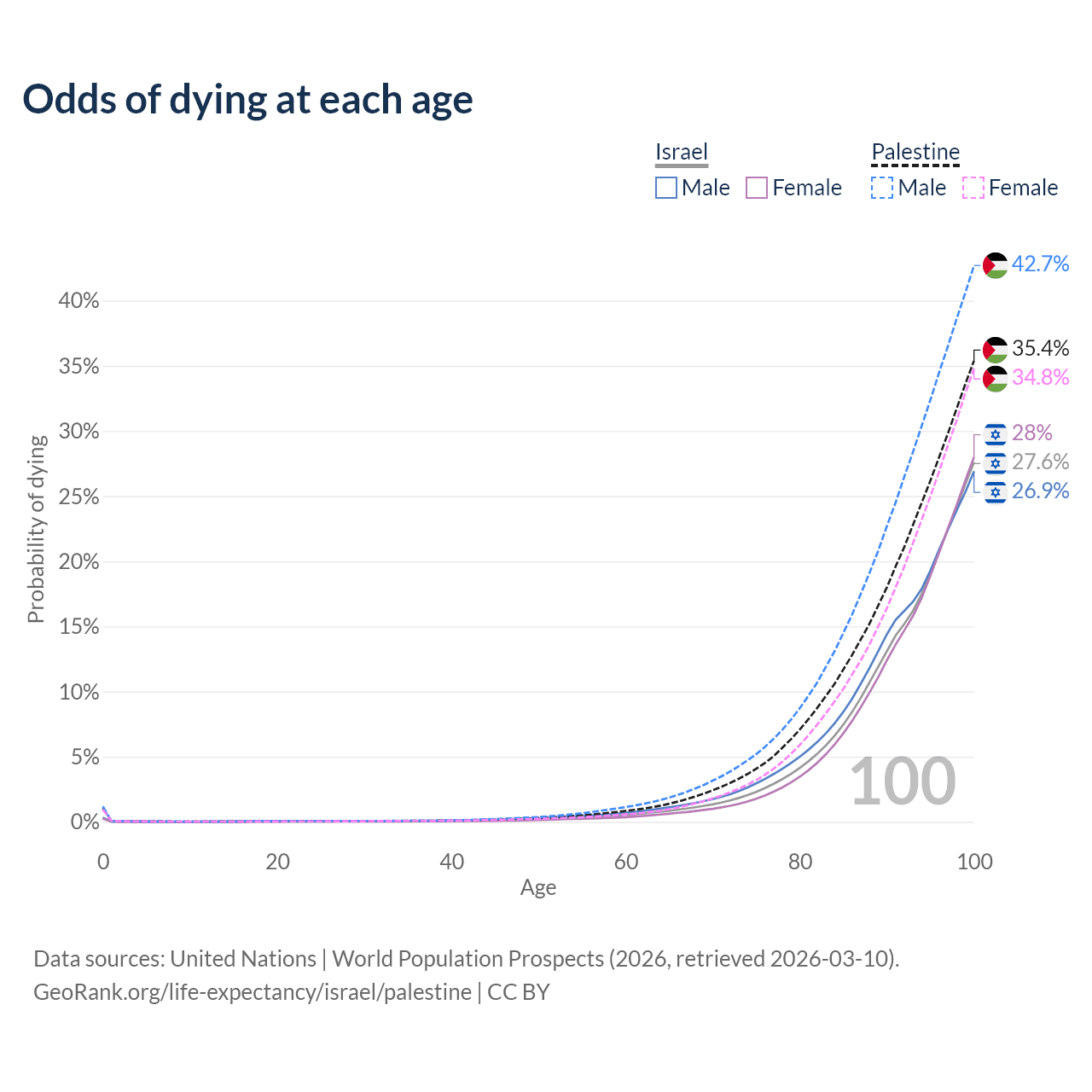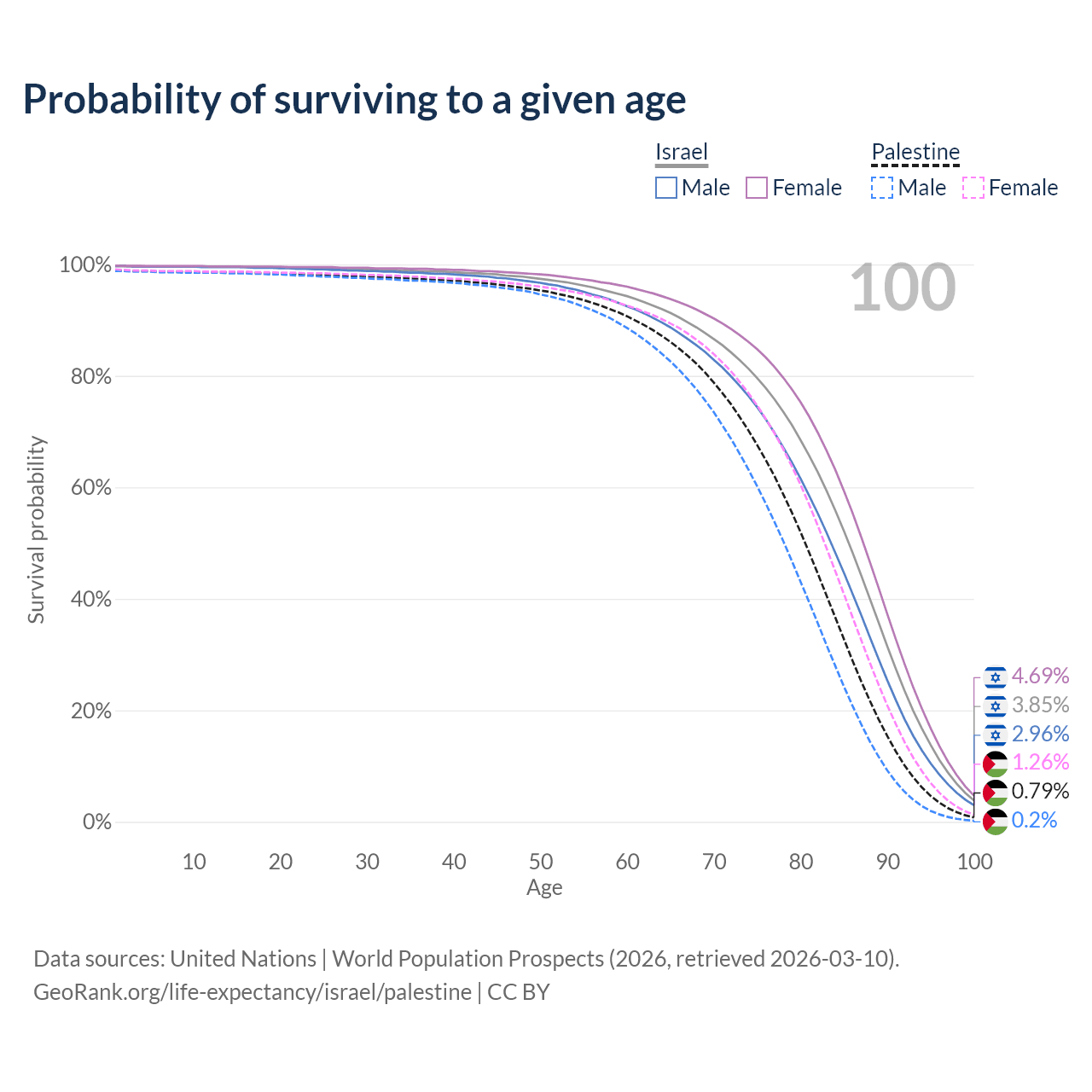 This life expectancy calculator shows the odds of living to 100, 95, 90, and below based on current age for both males and females in Israel and Palestine, along with mean and median age of death. The calculations are based on the 2026 life tables (actuarial tables) from the UN World Population Prospects.