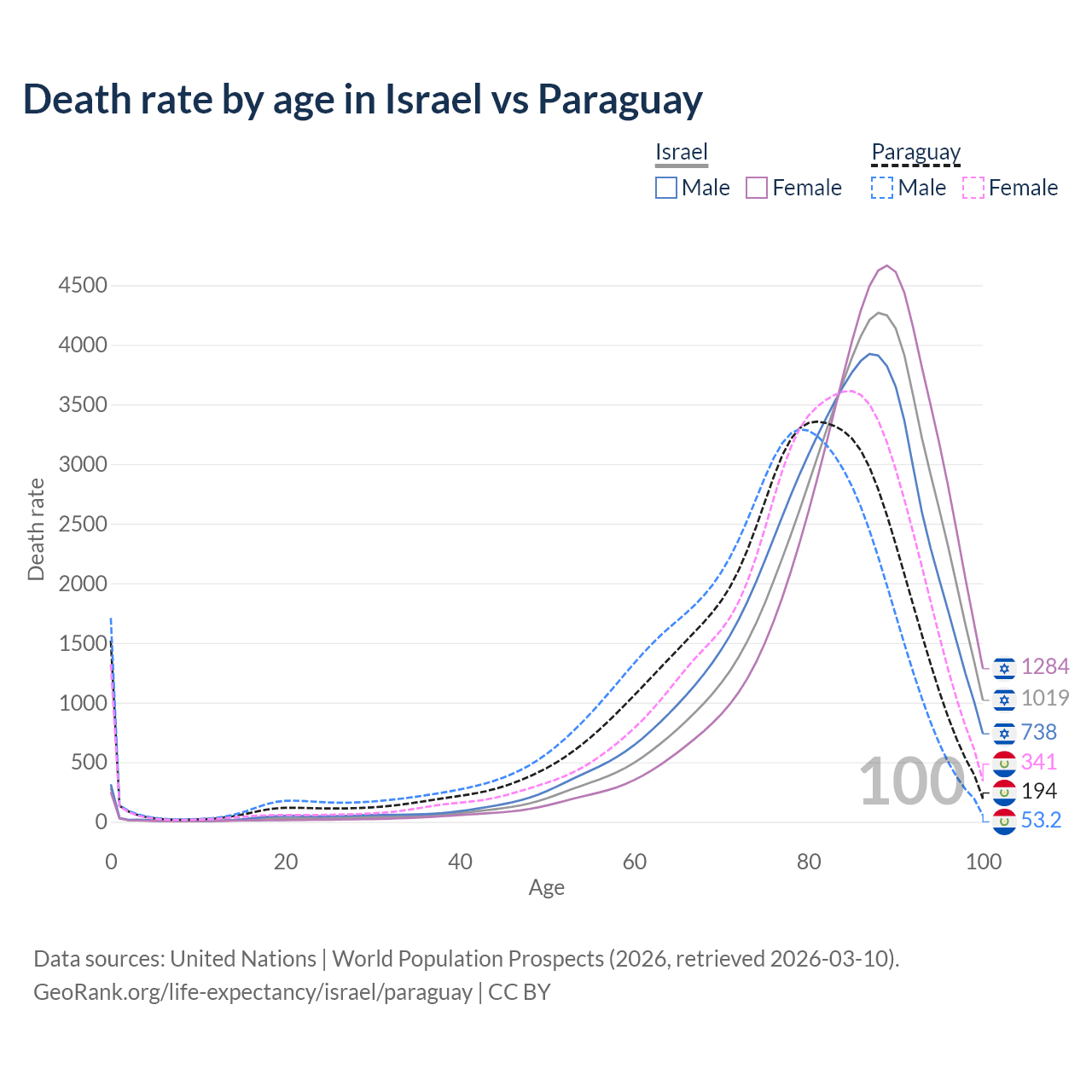 The average life expectancy at birth is 82.9 years in Israel vs 74.2 in Paraguay. Israel is ranked 21/197 by life expectancy, and Paraguay is 100/197. In Israel, the life expectancy is 80.8 years for males and 84.9 years for females. In Paraguay, it's 71.3 years for males and 77.4 years for females.