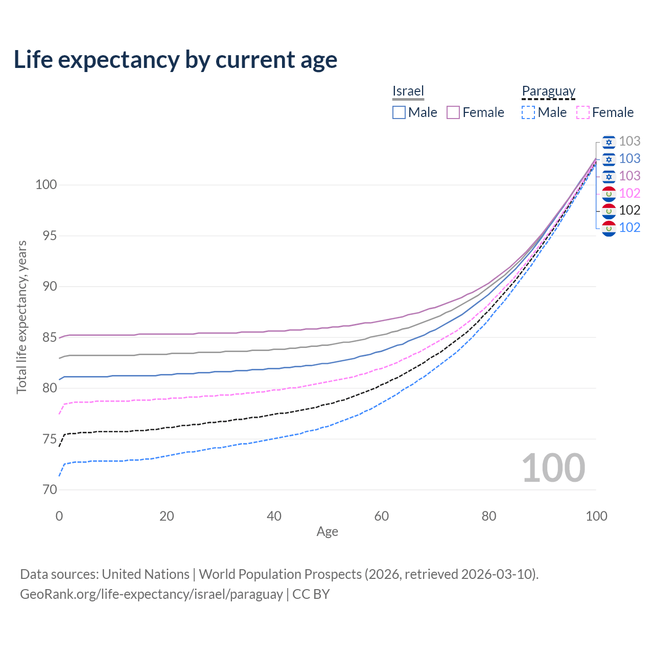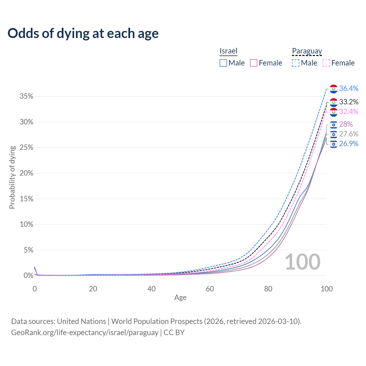 This life expectancy calculator shows the odds of living to 100, 95, 90, and below based on current age for both males and females in Israel and Paraguay, along with mean and median age of death. The calculations are based on the 2026 life tables (actuarial tables) from the UN World Population Prospects.