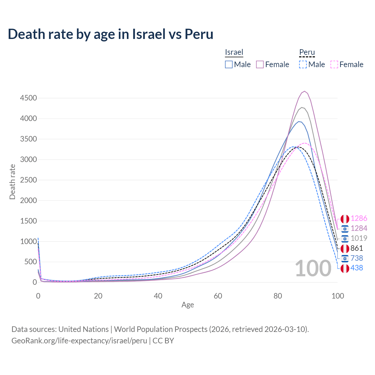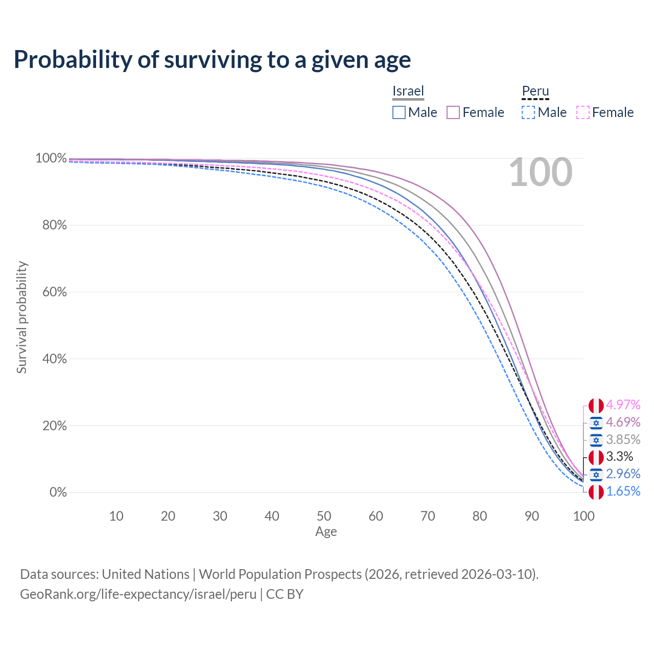 This life expectancy calculator shows the odds of living to 100, 95, 90, and below based on current age for both males and females in Israel and Peru, along with mean and median age of death. The calculations are based on the 2026 life tables (actuarial tables) from the UN World Population Prospects.