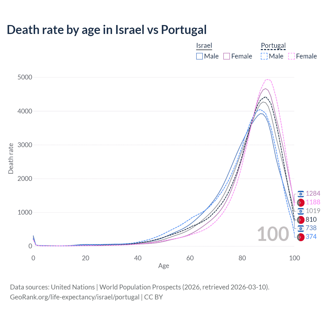 In Israel, the most common age of death is 88, compared to 89 in Portugal. The median age of death is 85.6 in Israel and 85.9 in Portugal, meaning only half of each cohort is expected to live past that age.
