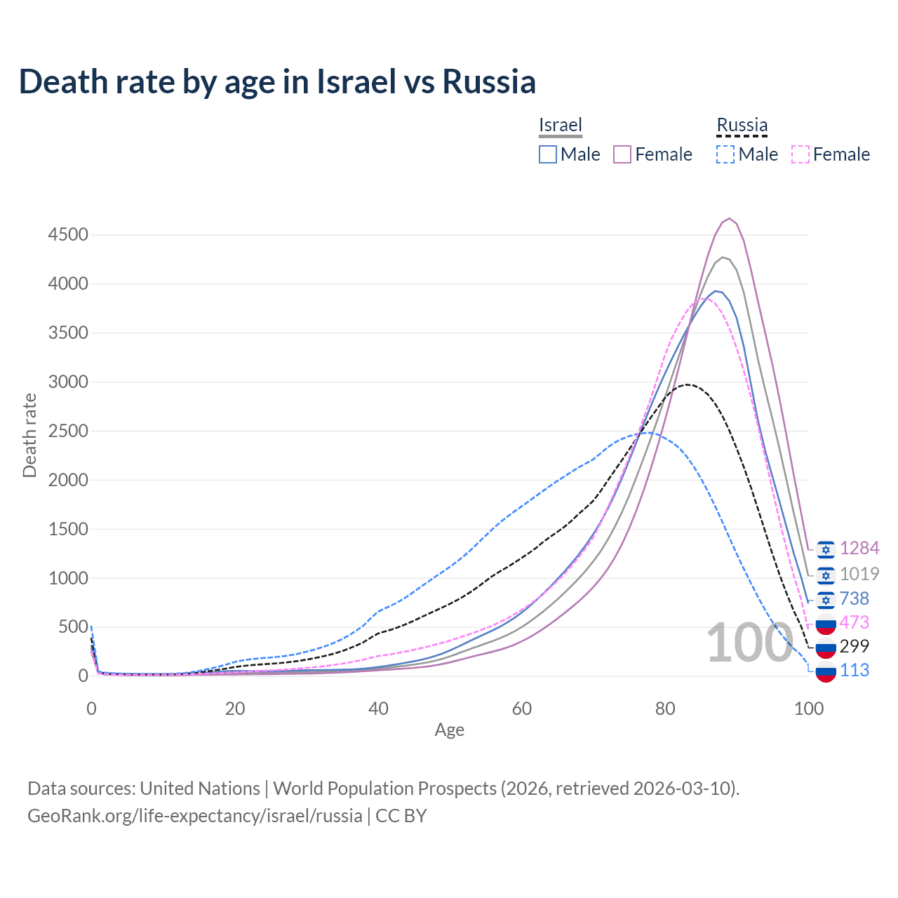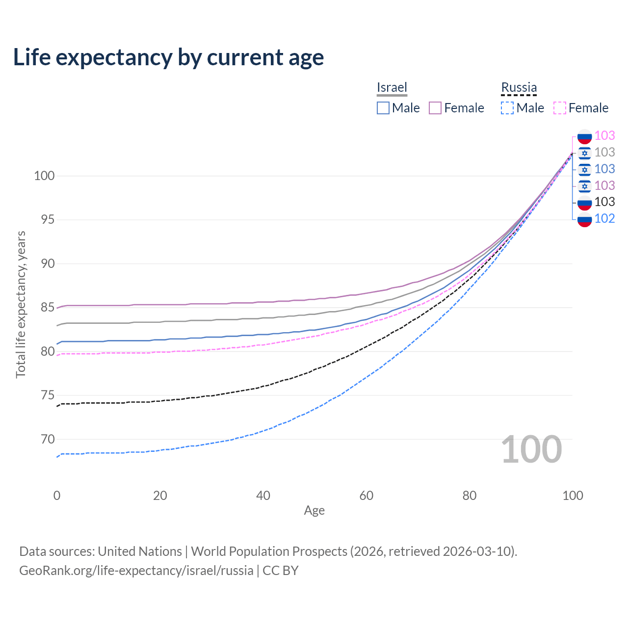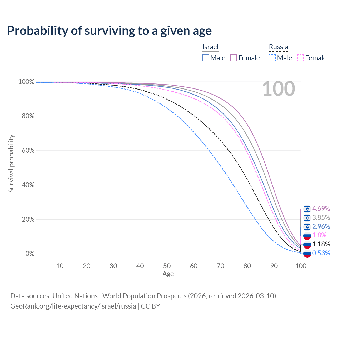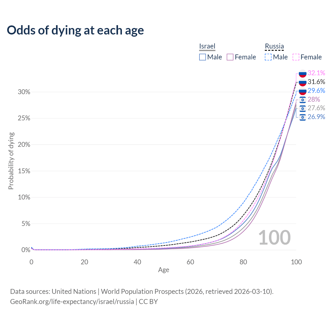 This life expectancy calculator shows the odds of living to 100, 95, 90, and below based on current age for both males and females in Israel and Russia, along with mean and median age of death. The calculations are based on the 2026 life tables (actuarial tables) from the UN World Population Prospects.