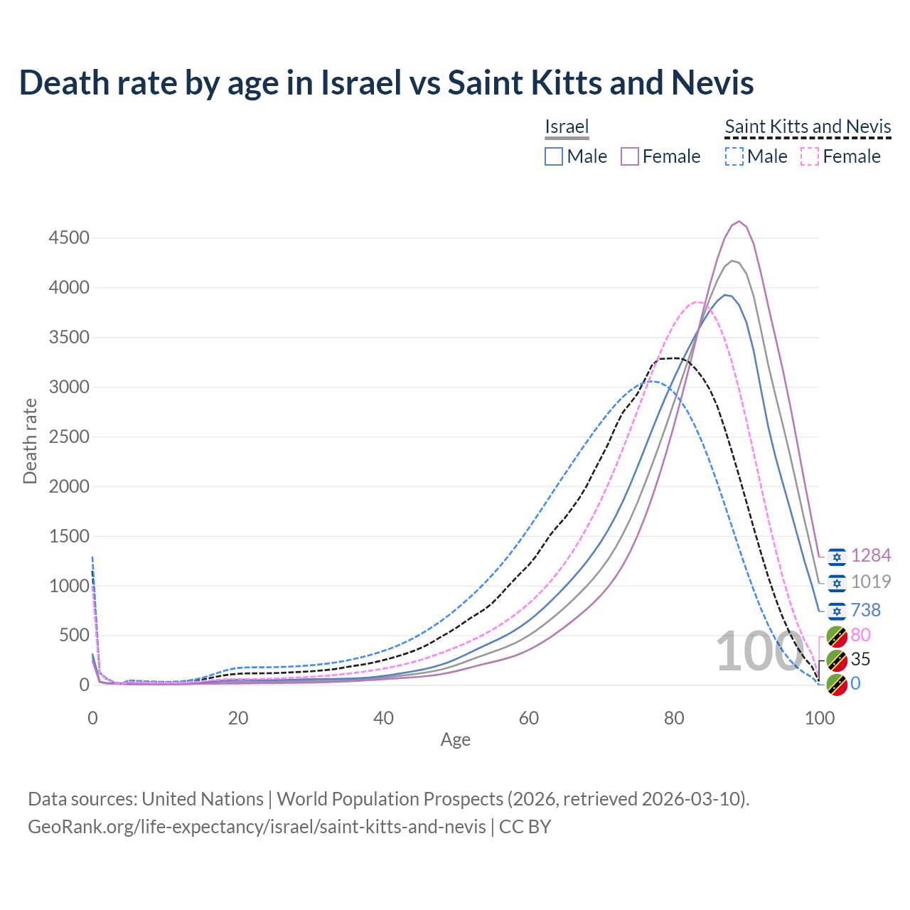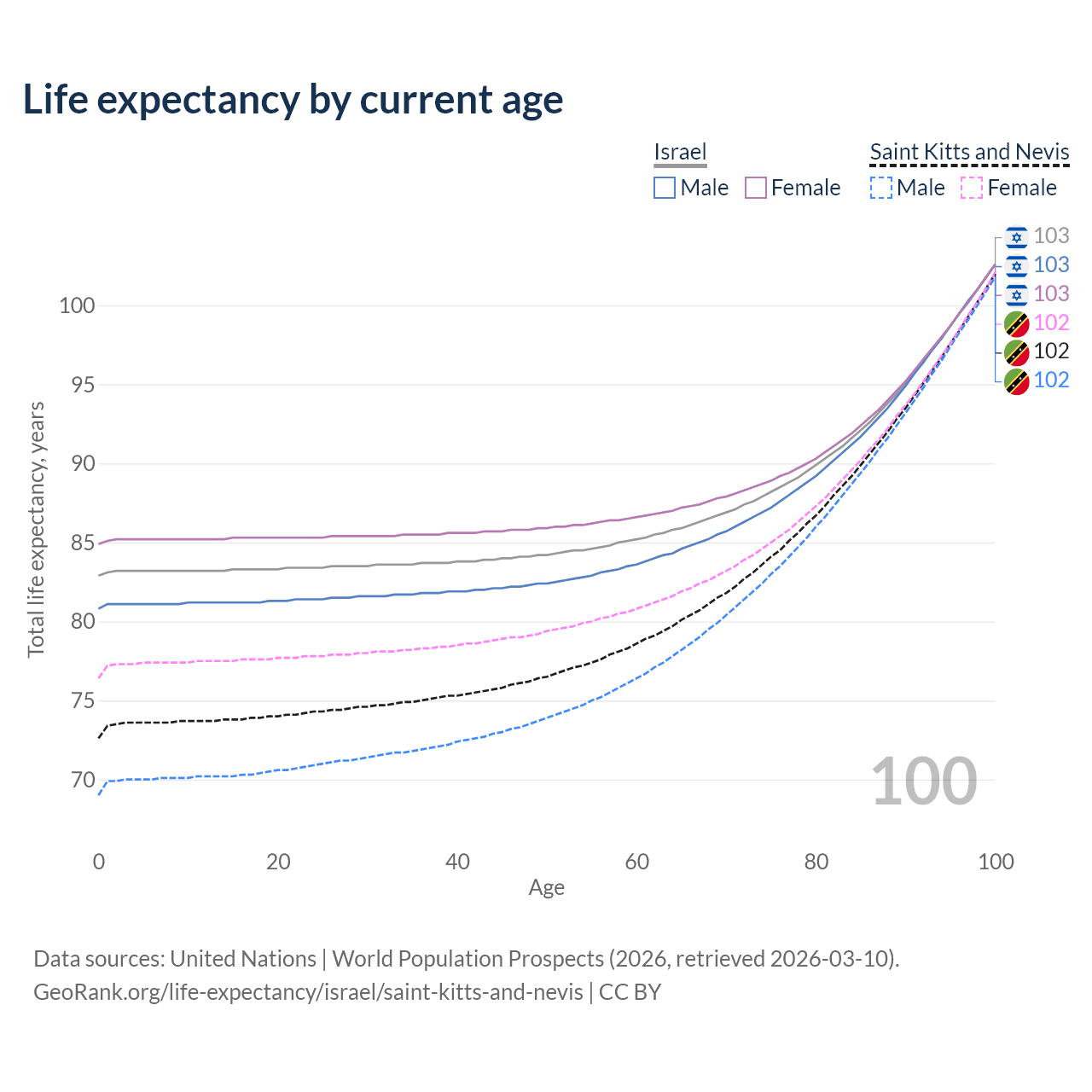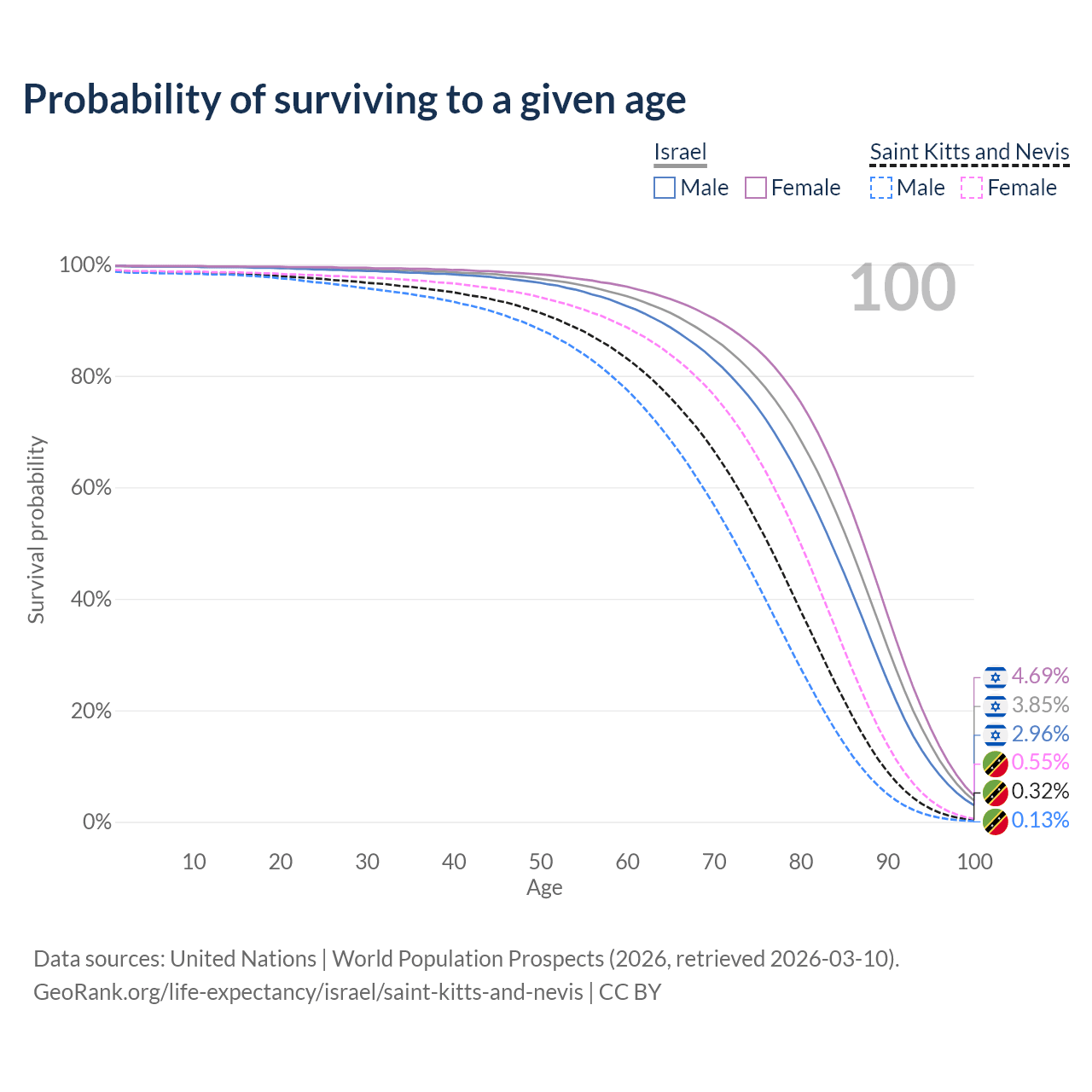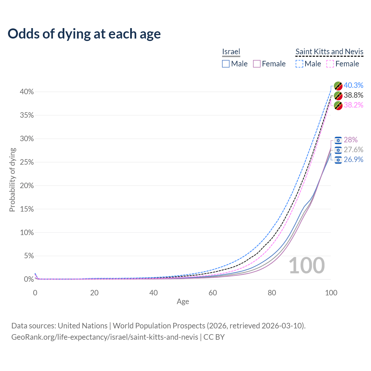 This life expectancy calculator shows the odds of living to 100, 95, 90, and below based on current age for both males and females in Israel and Saint Kitts and Nevis, along with mean and median age of death. The calculations are based on the 2026 life tables (actuarial tables) from the UN World Population Prospects.