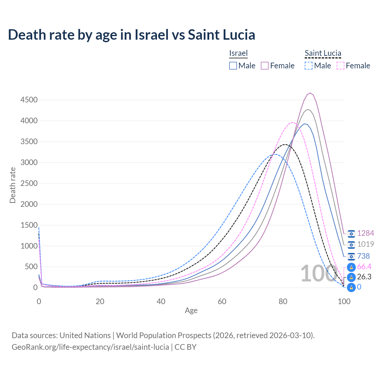 In Israel, the most common age of death is 88, compared to 81 in Saint Lucia. The median age of death is 85.6 in Israel and 76.8 in Saint Lucia, meaning only half of each cohort is expected to live past that age.